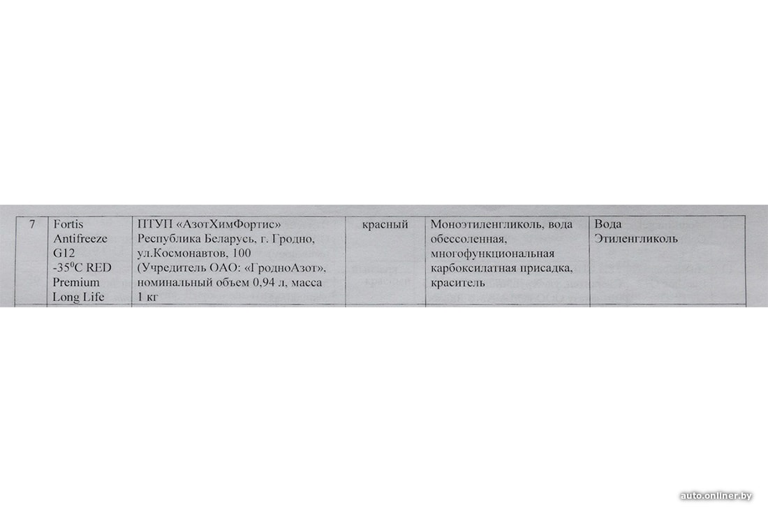 Белорусский антифриз Fortis выступал в исследовании как образец №7. Было очень любопытно узнать, что же производится гродненским предприятием. Однако ничего подозрительного.