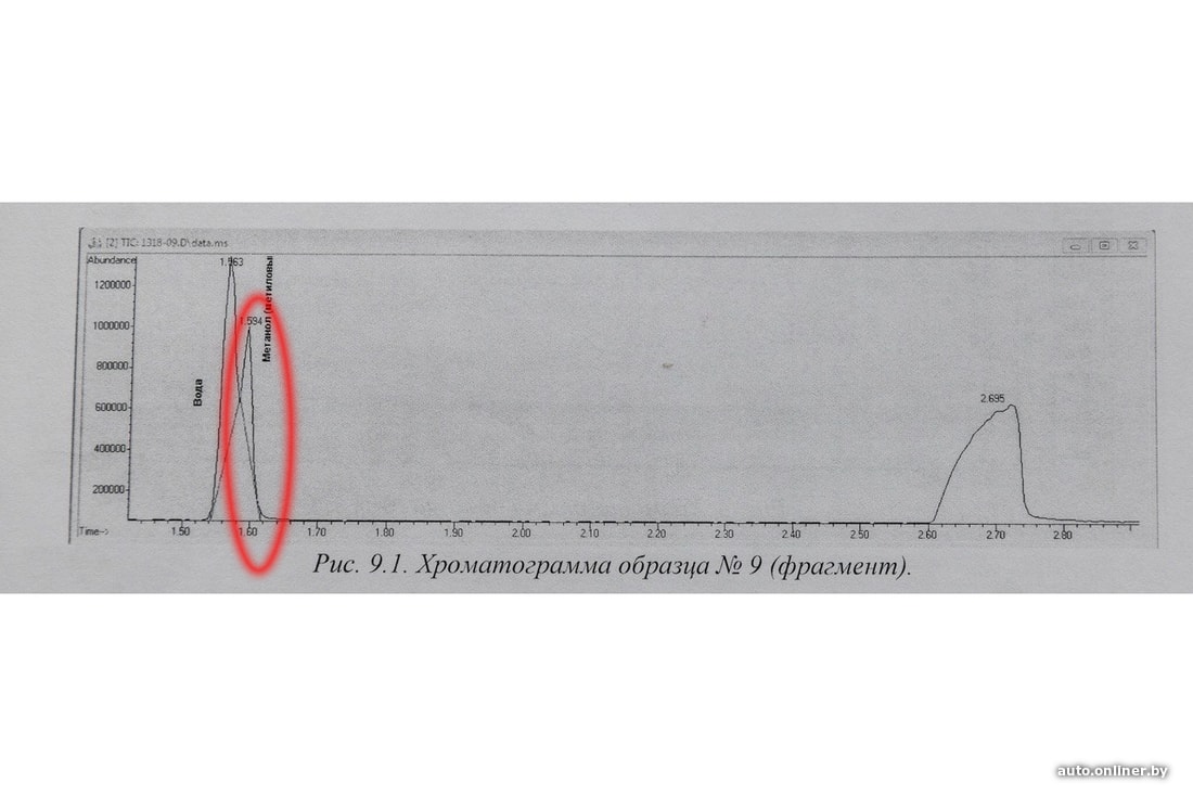 — Во время экспертизы данного образца (№9) был обнаружен метанол! — говорит Павел Шендик. — Причем это не примесь, то есть о случайном попадании говорить не приходится. Судя по хроматограмме, метиловый спирт содержится в достаточно большом количестве: его пик чуть меньше по площади пика воды.