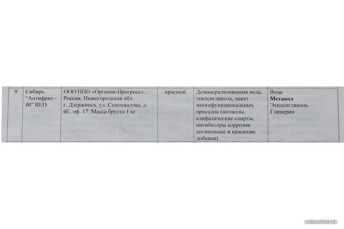 А вот «близнец» — антифриз «Сибирь» (образец №9) — смутил не только этикеткой. Дело в том, что состав расшифрован весьма хитро. В частности, указаны полиолы, к которым относятся как этиленгликоль, так и глицерин. Последний компонент могут добавлять в больших количествах для удешевления производства.