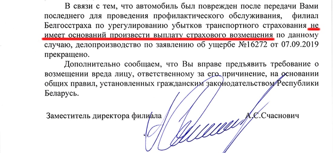 «Этот пункт нельзя назвать типовым, встречающимся в правилах всех страховых компаний, — заметили в „Белгосстрахе“. — Пункт о подготовке к проведению ремонтных работ был включен в наши правила для исключения двойного страхования. В таких случаях ответственность несет организация, которая проводит работы (например, СТО). Дело в том, что они сами страхуют свою ответственность. Этот пункт предусмотрен для того, чтобы не было пересечения страховок юридического лица (СТО) и физического (клиента). Иначе было бы две выплаты за одно и то же повреждение. В случае происшествия ущерб можно взыскать через суд. Но если станция, скажем так, адекватная, на месте обычно предлагают какие-то варианты разрешения ситуации. В суд обычно обращаются, если совсем никак».