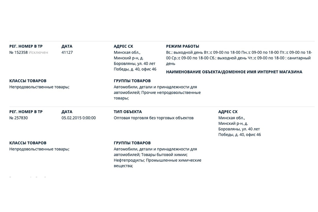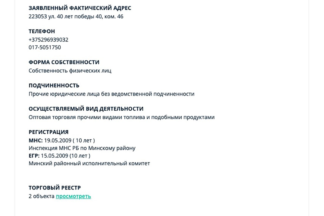 Информации об этой организации на kartoteka.by более чем достаточно. Зарегистрирована в 2008 году. Юридический адрес — г. Заславль. Компания регулярно получает декларации и сертификаты соответствия на моторные масла, технические смазки, охлаждающие низкозамерзающие жидкости и т. д.