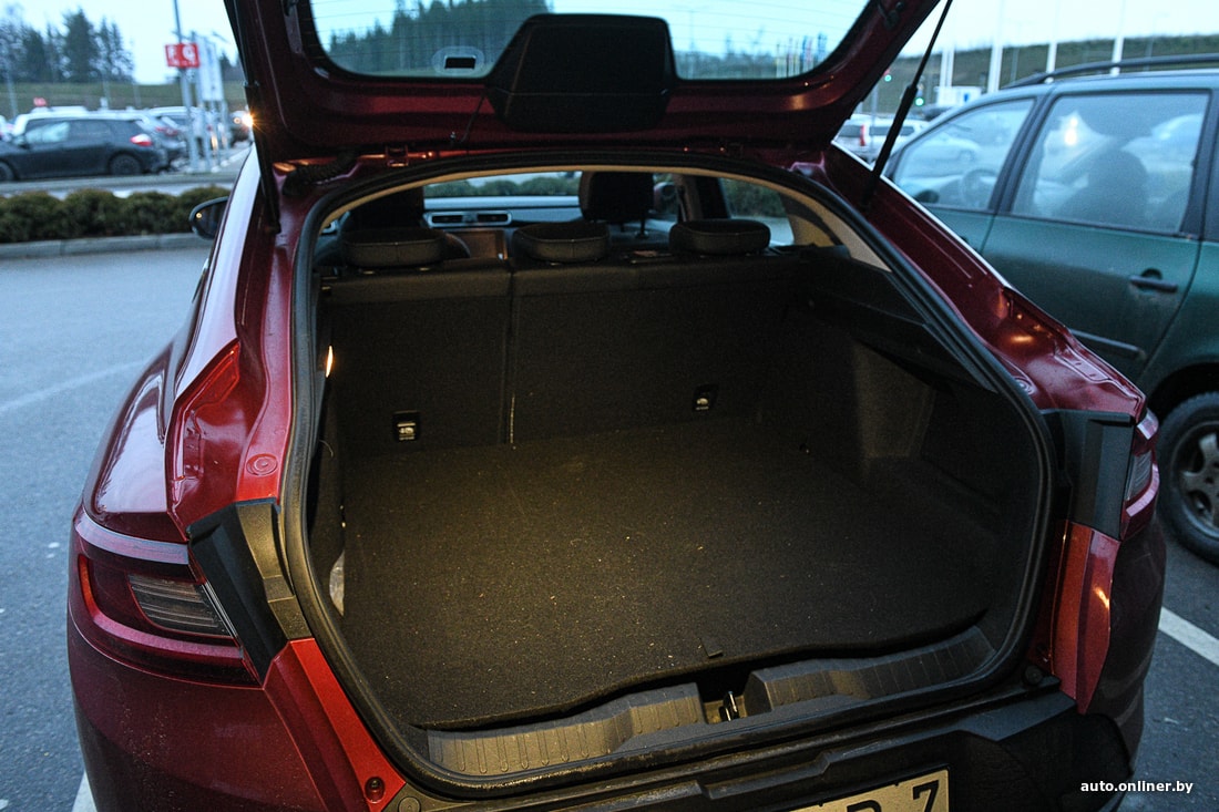 Кто-то находит силуэт Arkana похожим на силуэт не то BMW X4, не то BMW X6. Скошенная линия задней дверцы — это модно у купе. Но такая скошенность просто невероятным образом съедает место в багажнике. Повезло, что у нас были в основном мягкие пакеты с кучей мелких вещей: они сминались, но терпели — дверца закрылась.