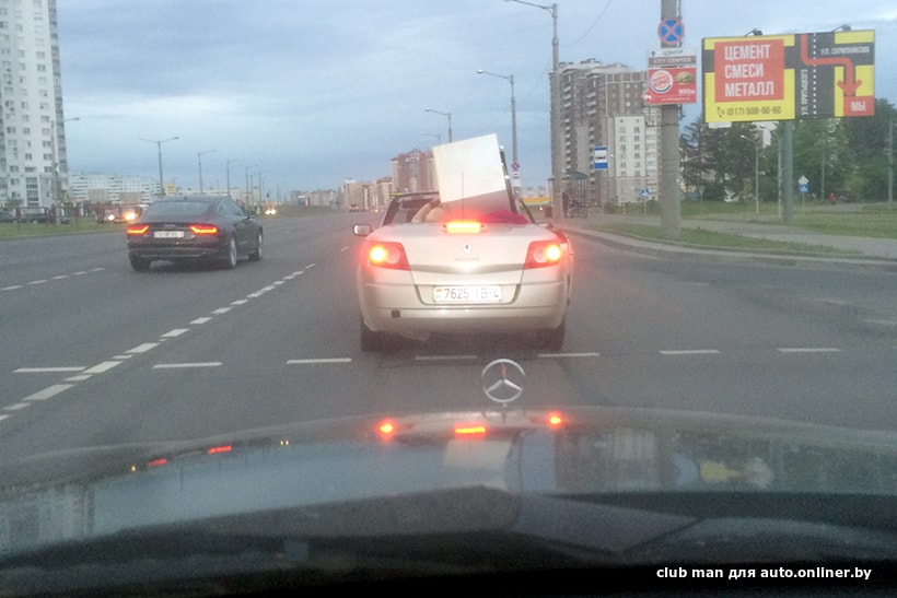 В июне 2017 года наш читатель club man видел, как на Renault везли холодильник. Не факт, что речь идет о том же автомобиле, по крайней мере, регистрационный номер другой. Но трудно поверить в то, что в Минске можно встретить два настолько похожих кабриолета, которые к тому же используются практически как фургоны.