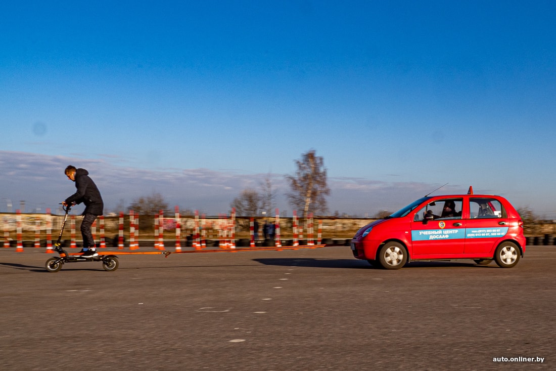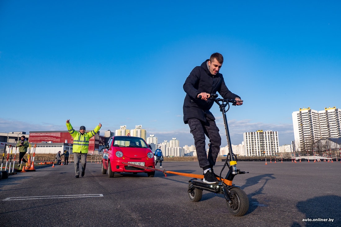 Эксперимент продолжается. Вместо моноколеса тяговой силой будет выступать электросамокат. Кажется, особой интриги нет. Очевидно, что резвое транспортное средство с легкостью справится с небольшим автомобильчиком.