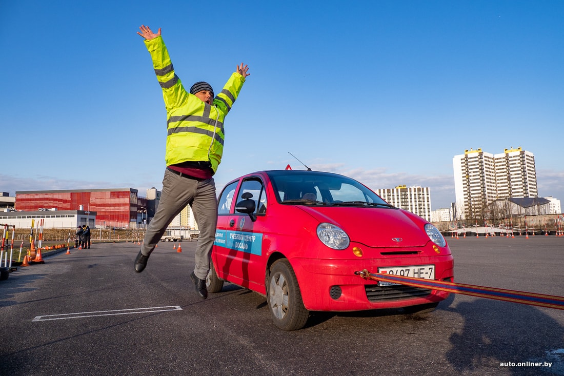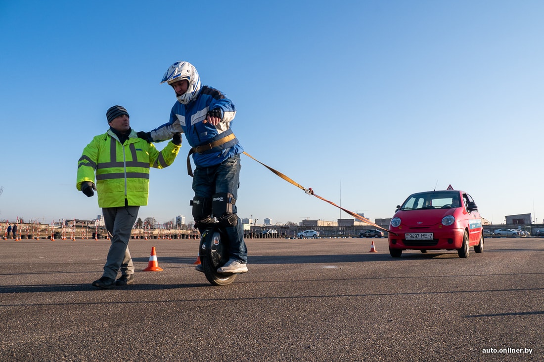 Автошкола ДОСААФ любезно соглашается предоставить учебный Daewoo Matiz, который попробует отбуксировать на моноколесе Игорь Сущенко.