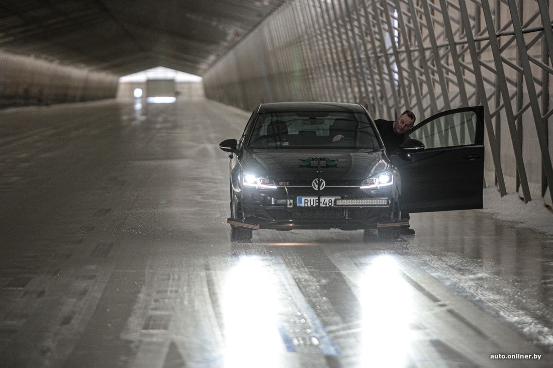 И заканчивая про финский хоккей. В White Hell есть закрытая площадка с чистым льдом, просто кристальным. Здесь, спрятавшись от солнечных лучей, тестируют поведение шин именно в таких условиях — на голом льду. Выглядит это завораживающе: автомобиль чуть разгоняется и затем тормозит. Что происходит? Ну почти ничего — он скользит. Я сам раза два упал, хотя просили быть осторожнее.