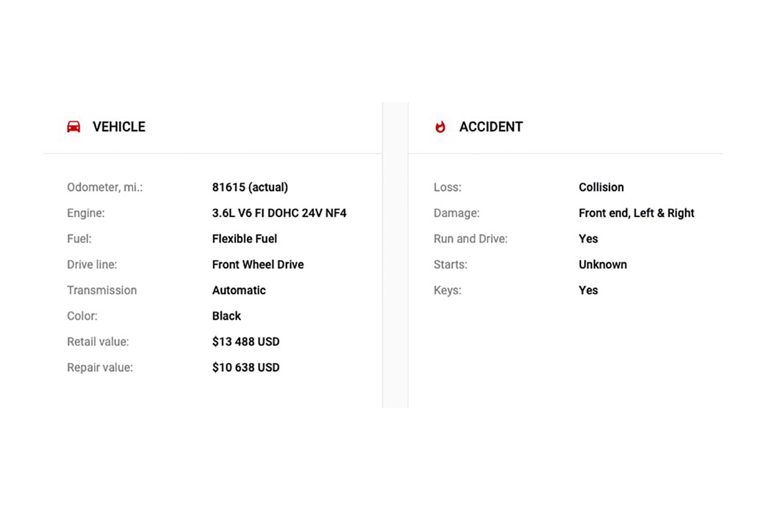— Сделаю акцент: 7-местный автомобиль в хорошей комплектации, есть электродвери, автозапуск. Объем двигателя — 3,6 литра (V6). Автоматическая коробка передач, задняя полусфера тонирована. Пробег — 81,6 тыс. миль. Судя по информации продавца, повреждены передняя часть и незначительно боковые стороны, выстрелила подушка безопасности, расположенная в рулевом колесе. Однако машина заводится и едет.