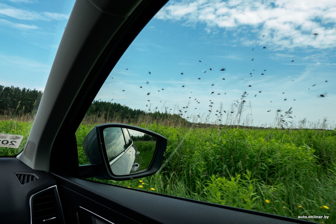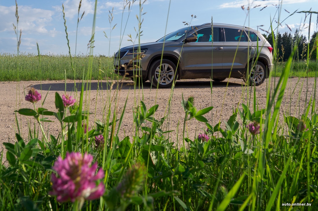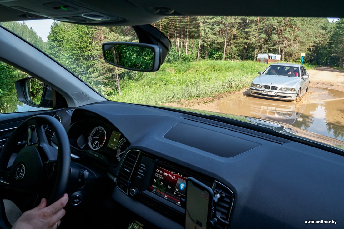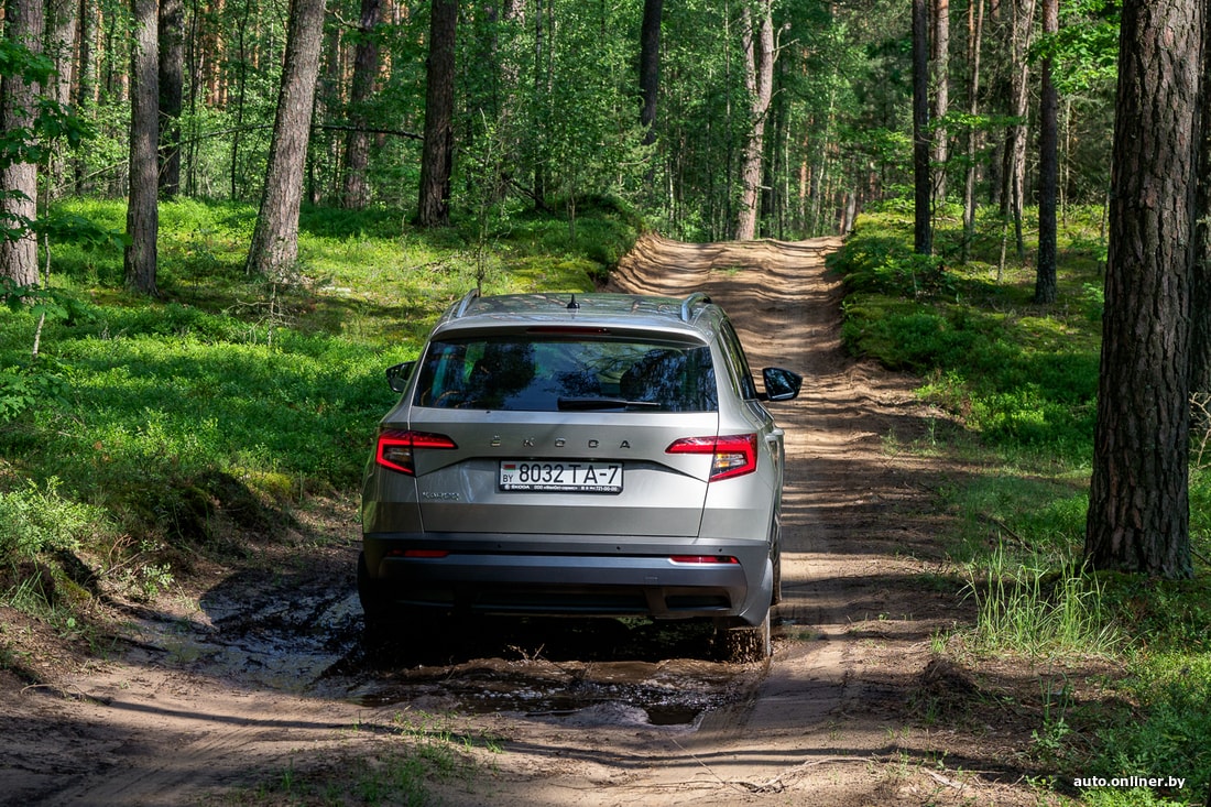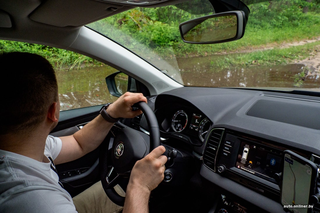Едем в направлении берега, чтобы посмотреть, как устроены организованные места отдыха. В нашем распоряжении Skoda Karoq, и повышенный клиренс весьма кстати: приходится то форсировать глубокую лужу на гравийке, то объезжать корни деревьев на лесной дороге.