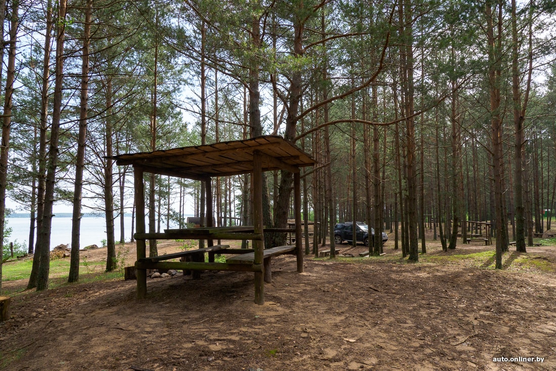 Первая точка — кемпинг «Варадеро» (совпадение или нет, но так называется известный кубинский курорт). Вокруг сосновый лес, рядом — мягкая озерная вода. Из удобств — навесы, беседки, мангал, баня и так далее.