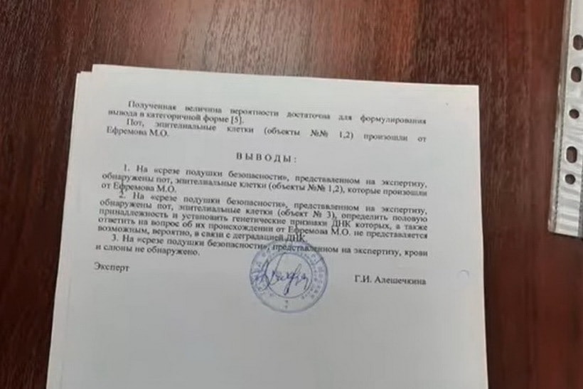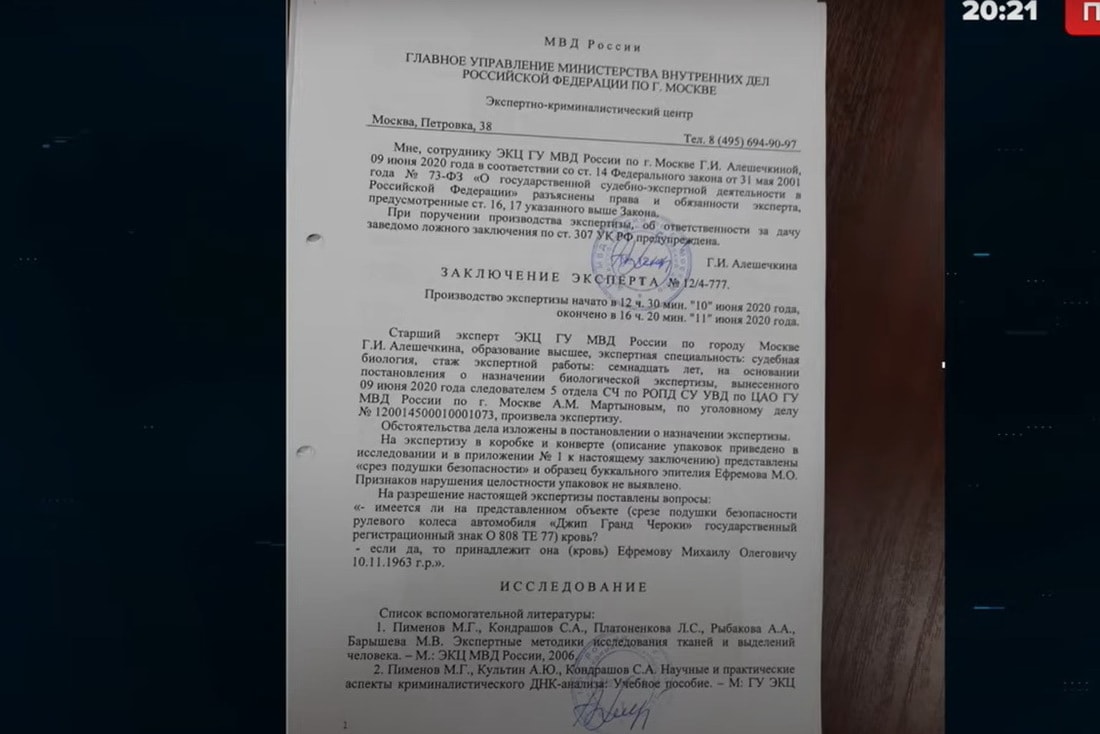 Тем временем телеведущий Владимир Соловьев показал в своей передаче заключение экспертизы МВД (где взял — не сказал), сообщив: «Наконец сегодня, в общем-то, поставлена точка на i: Ефремов находился за рулем машины, то есть там не марсиане, не нечистая сила, а сам Ефремов».