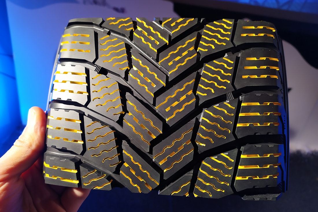 Одна из ключевых особенностей — степень ламелизации протектора и ее глубина. Пресс-форма была сделана с помощью 3D-принтера. В компании заверяют, что по мере износа глубина канавок остается практически неизменной. Производитель стал использовать два типа ламелей: переменной толщины (для вывода водяной пленки из пятна контакта) и П-образные (помогают добиться большей жесткости блока при маневрировании). У моделей, предназначенных для вседорожников, предусмотрен двойной каркас — чтобы увеличить прочность и повысить курсовую устойчивость.