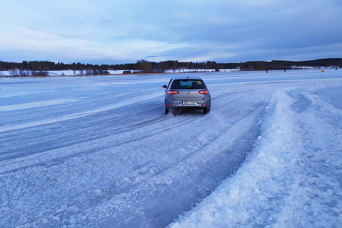 Пересаживаемся на переднеприводный Volkswagen Golf с «механикой» для прохождения слалома по льду озера, припорошенному снегом. За сцепление отвечает комплект новых шин. Инструкторы заверяют: дальше второй передачи не дойдете. Оказались правы. Трасса с ее извилистостью, видимо, нарочно была построена так, чтобы напомнить пилотам о навыках выхода из заносов.