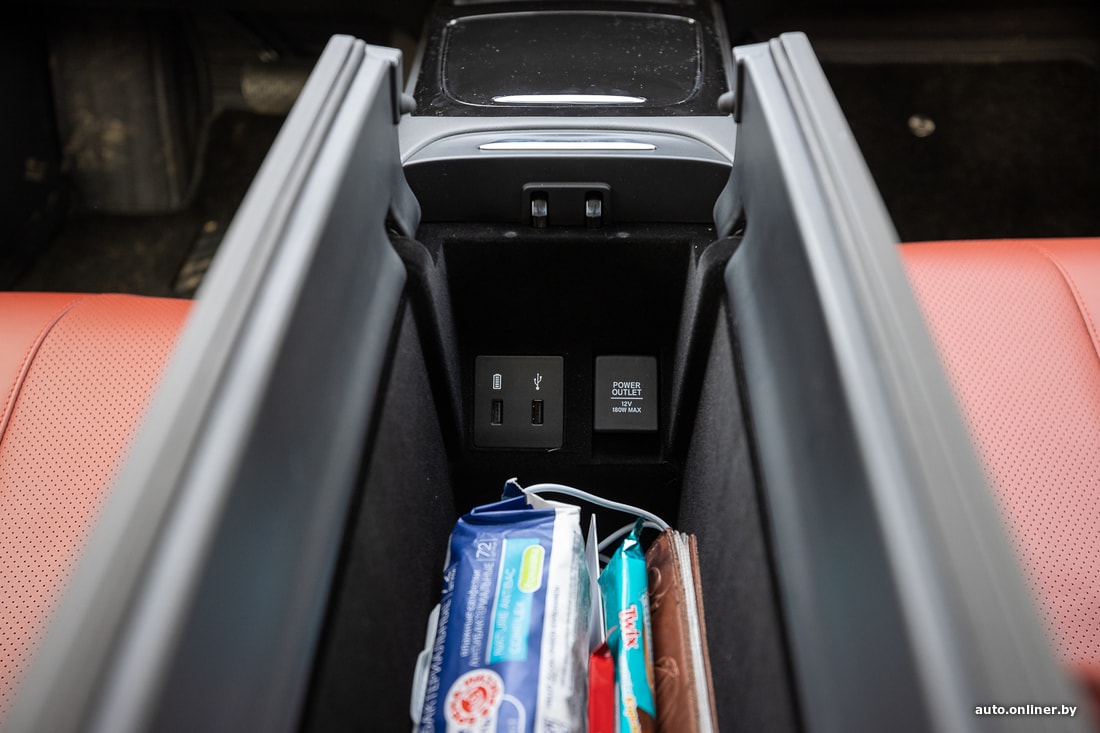 Дисплеи приборной панели и мультимедийного блока находятся на одном глянцевом щитке, и картинка на них очень достойная. Центральный экран заметно меньше, чем у Model 3, но более гармонично вписывается в переднюю панель. Воздуховоды отопительной системы расположились чуть ниже экрана, а в «подвале» центральной консоли находится беспроводная зарядка. В подлокотнике — вместительная ниша для мелочовки.