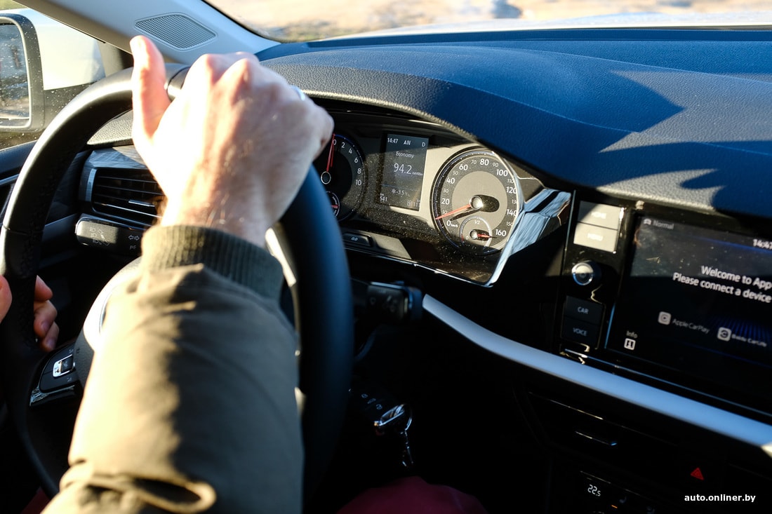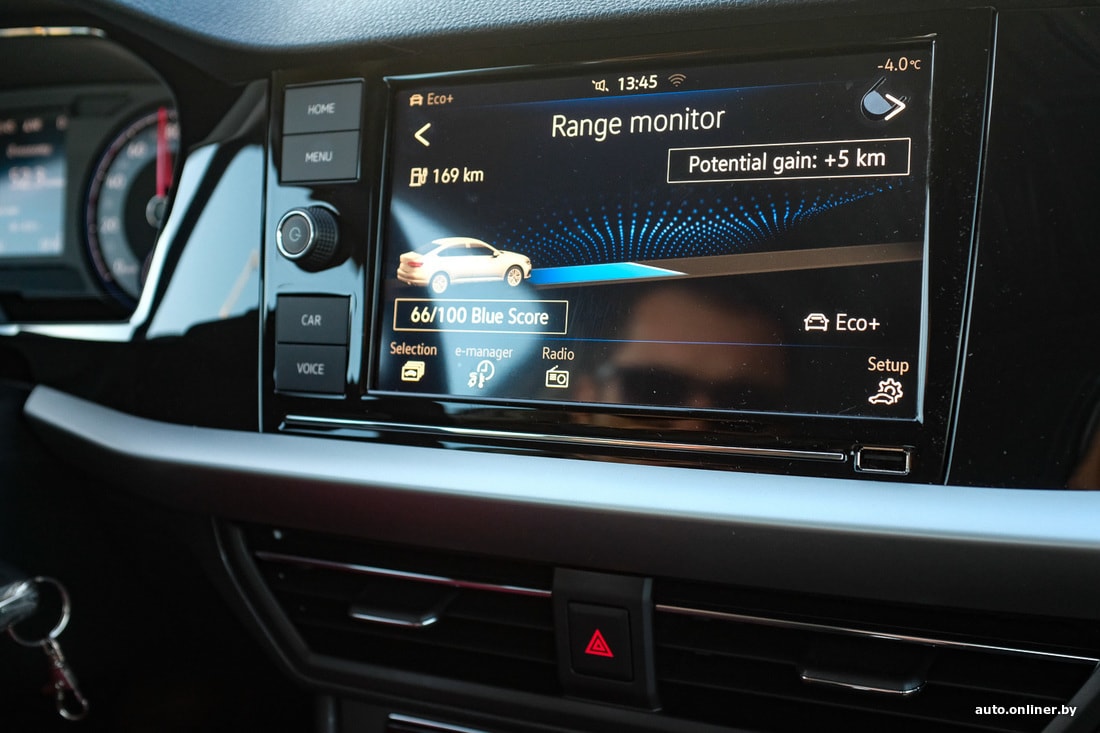 Приборную панель перекроили под электрическую силовую установку. Спидометр расчерчен всего до 160 км/ч. В 1990-х дети засмеяли бы. Вместо тахометра — аналоговая стрелка с указанием потребляемой энергии (в процентах). Иконку бензобака заменили на логотип аккумулятора. Экран бортового компьютера такой же, как у старой Jetta, но вместо расхода топлива здесь, само собой, — количество потребляемых «киловатт» на 100 км (или в час, если машина стоит). В общем, с интерфейсом e-Lavida за пару минут разберется даже тот, кто ни разу не сидел в электромобиле.