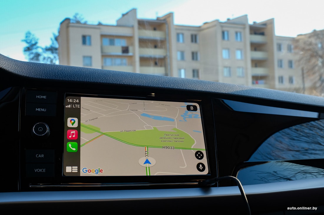 На тоннеле — два цепких подстаканника и бокс для смартфона. Автомобиль имеет официальную поддержку Apple CarPlay и Android Auto. Синхронизация производится по проводу. «USB-пуповина» расположена у подножья экрана. Не лучшее место. Штатная навигация думает, что Прилуки — это деревня возле Шанхая. К счастью, можно использовать карты Google.