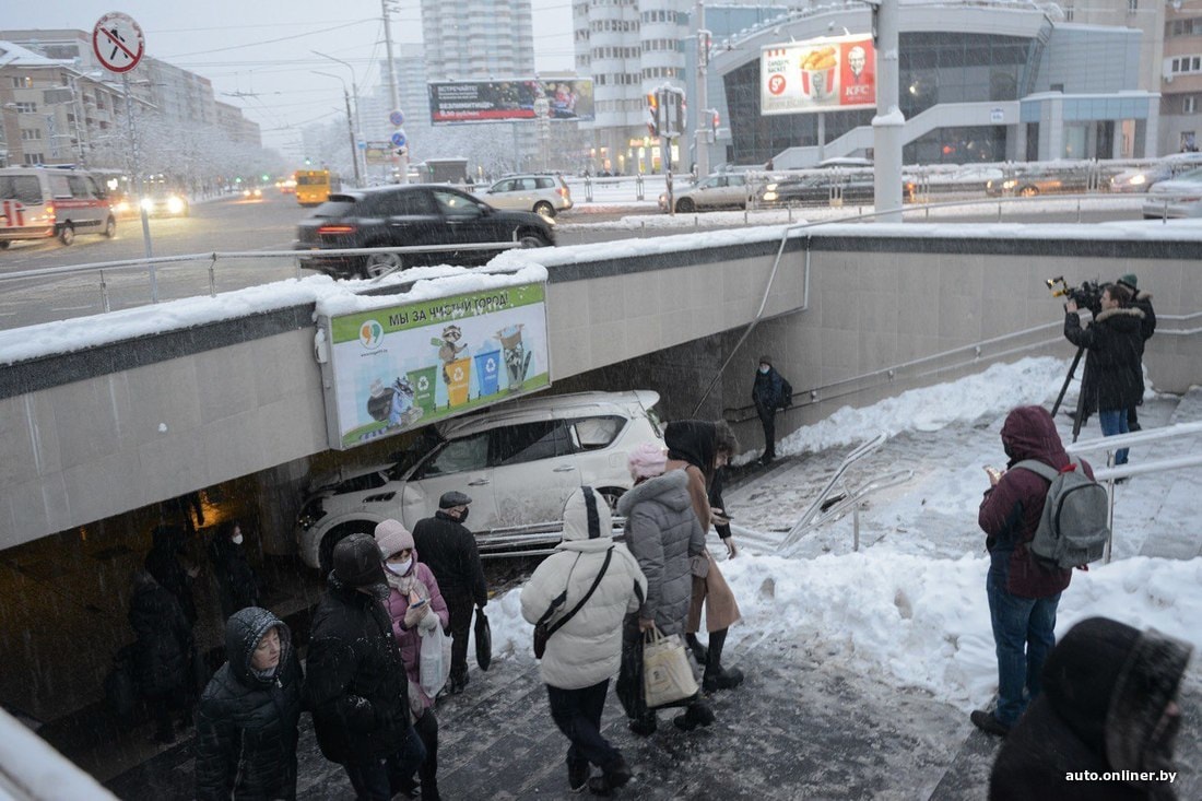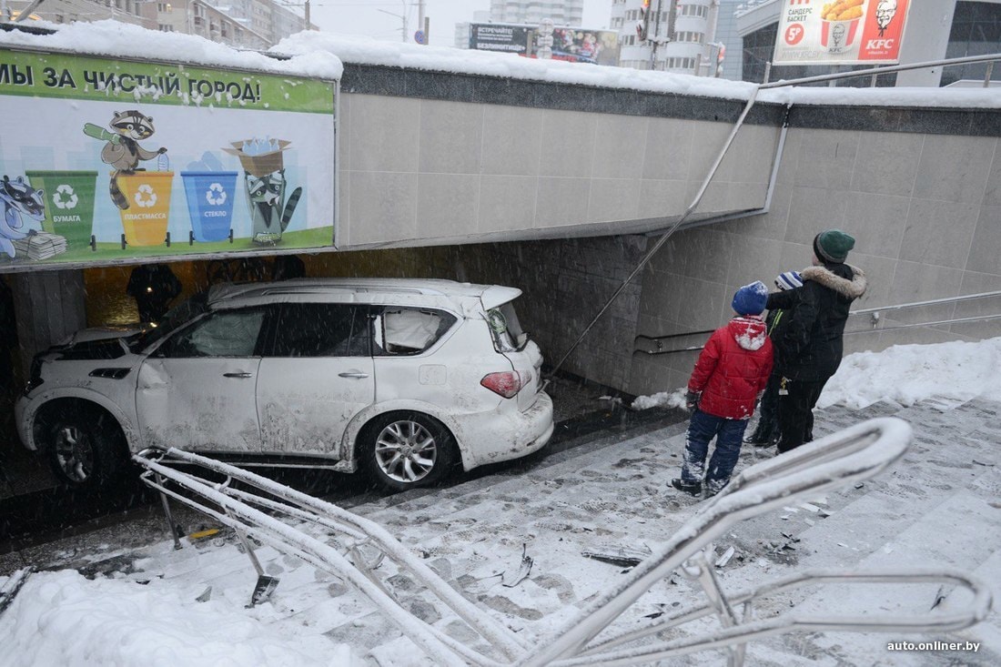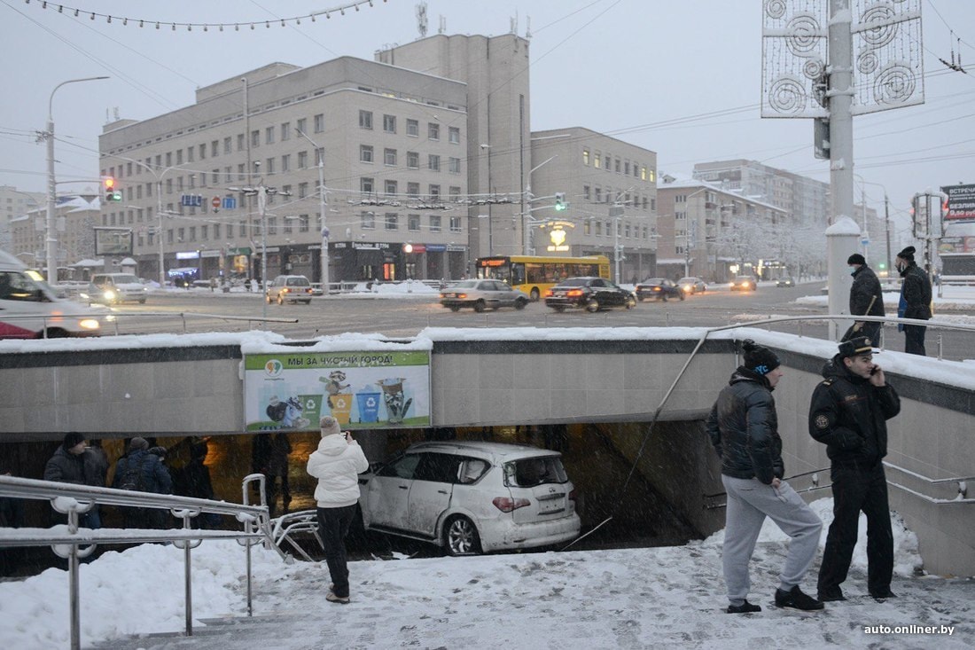 — По предварительной информации, 42-летний водитель (имеет вид на жительство в Беларуси) автомобиля Infiniti, двигаясь по улице Веры Хоружей со стороны улицы Богдановича, при совершении левого поворота на улицу Куйбышева не справился с управлением и въехал в подземный пешеходный переход. В результате ДТП автомобиль получил механические повреждения. После осмотра медиков водитель отпущен.