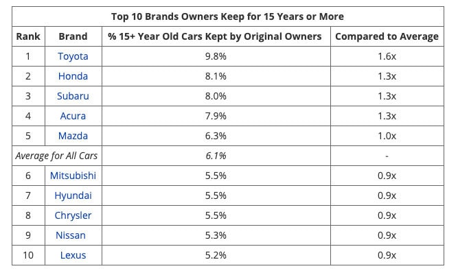 Исследователи также составили таблицы по сегментам. Как видите, чаще всего люди не спешат менять японские автомобили. Кто был в США, наверняка обратил внимание на большое количество Toyota и Honda. И еще обратите внимание на пункт Average в таблицах. Он означает средний показатель 15-летнего владения машинами в данном классе.