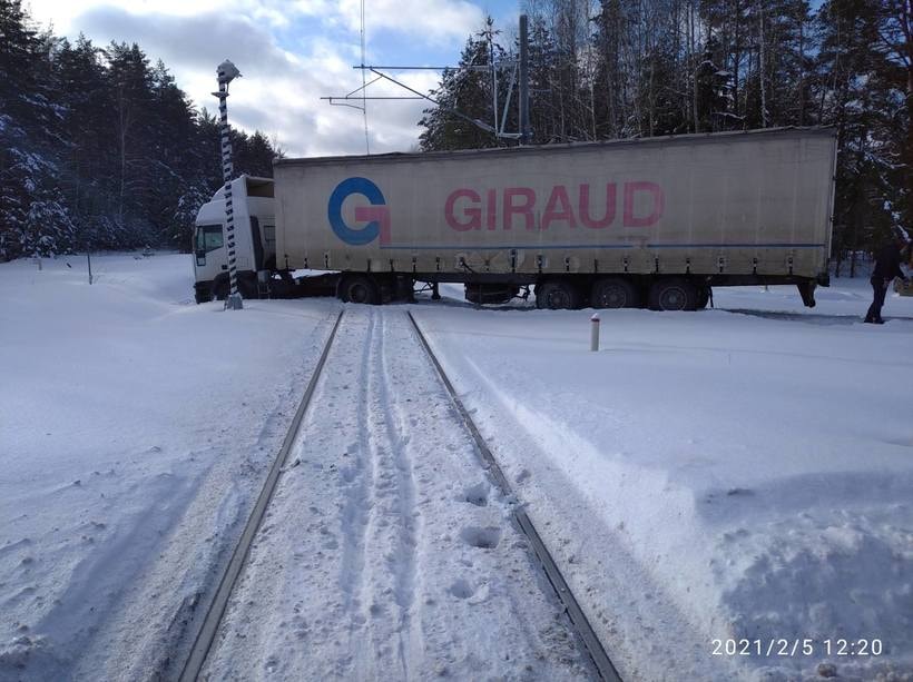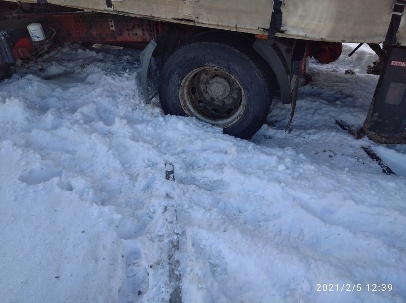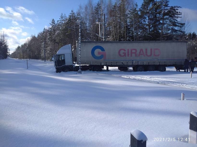 «Когда я подъехал, фура уже стояла. Очевидно, либо занесло, либо просто на закруглении поехала прямо, — рассказал очевидец. — В итоге попала на железнодорожные пути, никак не могла сдвинуться с места. Под слоем снега — лед. К счастью, грузовик стал в стороне от проезжей части».