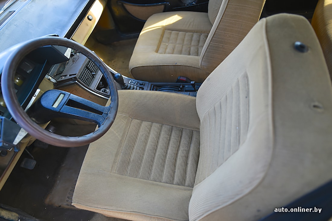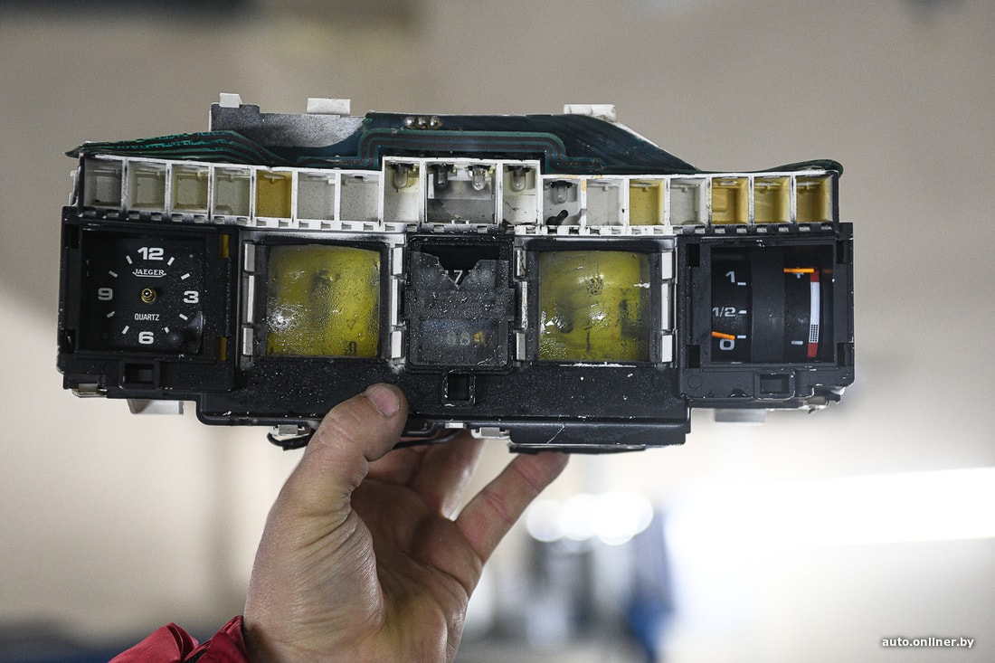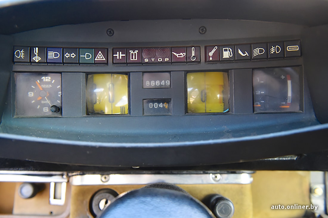 Сквозной коррозии не было. Судя по показаниям толщиномера, перекрашивали машину всего один раз. Автомобиль заводился, но бензин из бака не поступал в 2,4-литровый 116-сильный мотор — возможно, был неисправен насос. Также требовала ремонта гидропневмоподвеска. В салоне же было уютно, но грязновато. Односпицевый руль, уникальная «приборка», кварцевые часы и механические тахометр со спидометром — где еще такое встретишь?