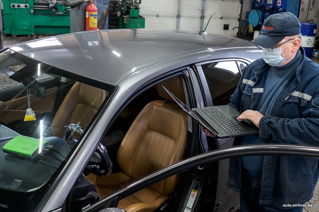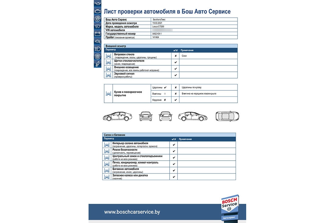 «На заднем стекле обнаружены царапины. Также заметен маленький скол на лобовом стекле, — специалисты Bosch в первую очередь описали результаты визуального осмотра. — Есть потертости на переднем бампере, вмятина на переднем крыле». По поводу последнего нюанса Александр пояснил, что таким автомобиль приехал в страну.