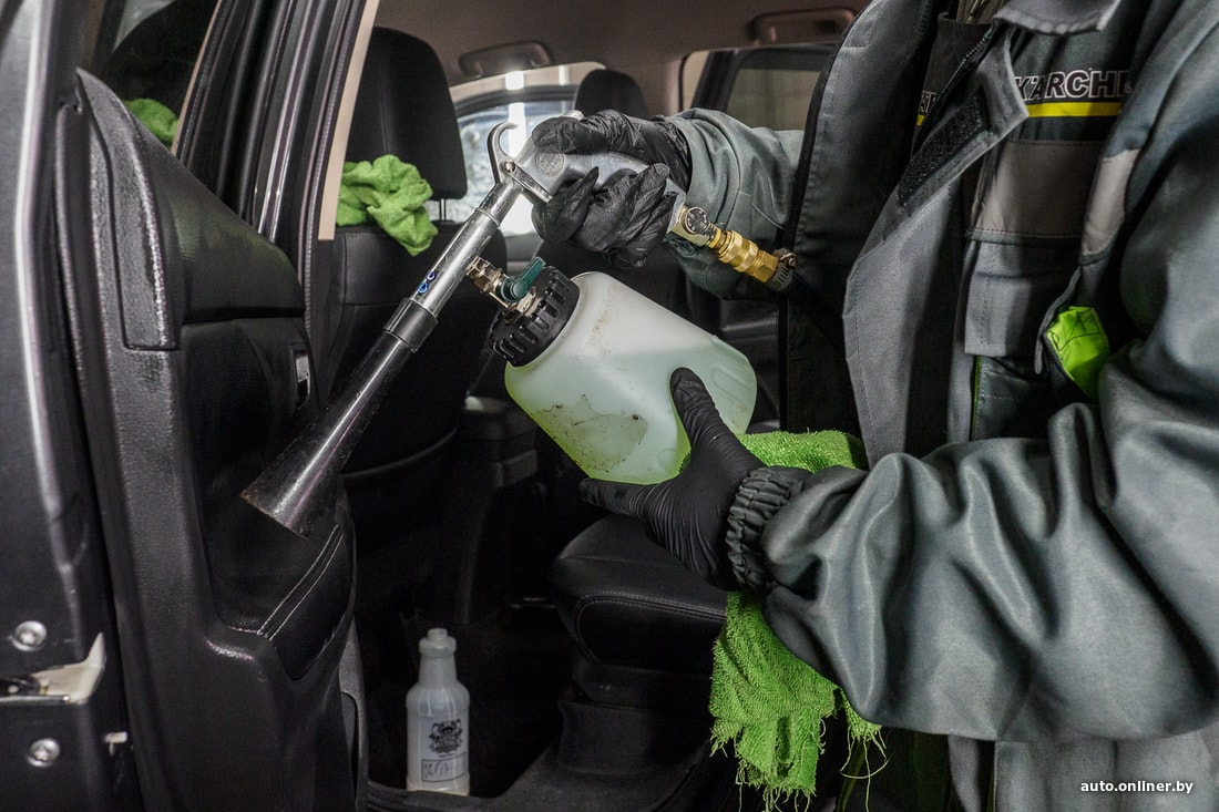 — Существует несколько этапов чистки, — наставляет нас Евгений Сенько. — Если мы говорим о тканевых салонах, то сначала можно использовать щеточку из мягкого ворса. Есть торнадор — устройство, которое под высоким давлением пробивает поверхность химией. Как правило, он справляется с ситуациями, когда вручную щеткой не идет. Для самых трудных случаев многократно используются оба метода, добавляются различные чистящие вещества.