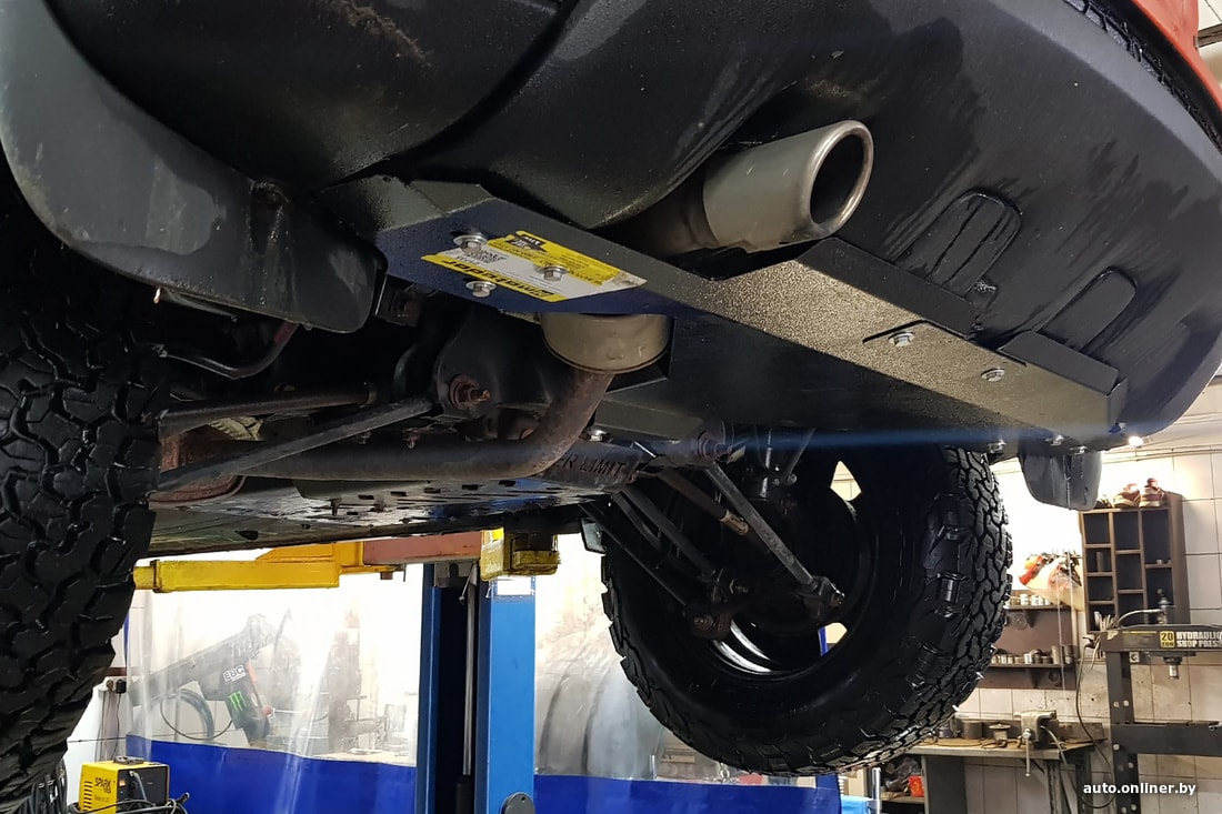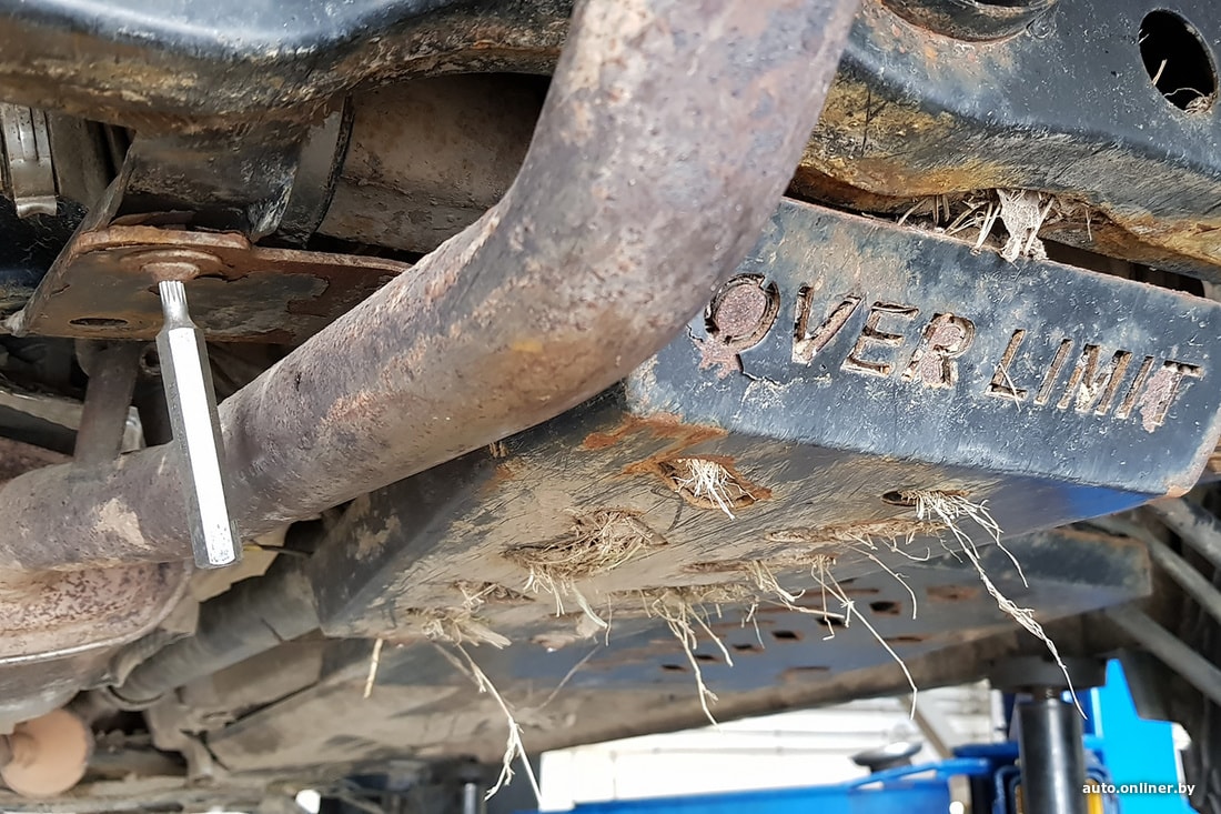 — Ну и раз мы уже могли проехать по глубокой колее, следующим обязательным пунктом стала защита. Здесь я также выбрал Overlimit. Получился следующий комплект: сзади установлена защита редуктора и топливного бака, которая обошлась примерно в тысячу рублей. Позднее добавил еще и защиту заднего бампера: он постоянно работал «грейдером» в колее и все норовил оторваться. Но 130 рублей решили проблему — появилась стальная пластина толщиной 2 мм, которая превратила задний бампер в единое целое с защитой бака.
