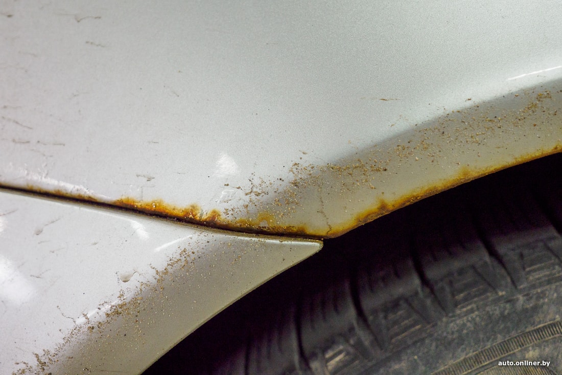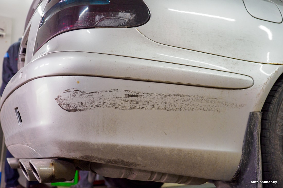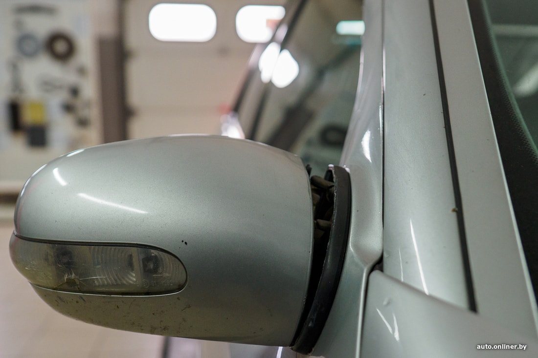 Из визуальных нюансов мастера выделили сколы на лобовом стекле, царапины на бамперах, вмятину на крышке багажника, коррозию на передних крыльях и задних арках, потертости на обивке, отсутствие декоративной накладки обшивки двери, неработающий стеклоподъемник водительской двери, отсутствие докатки, неработающие повторитель поворота справа и правую противотуманку. Задние фонари, как выяснилось, не заводские.