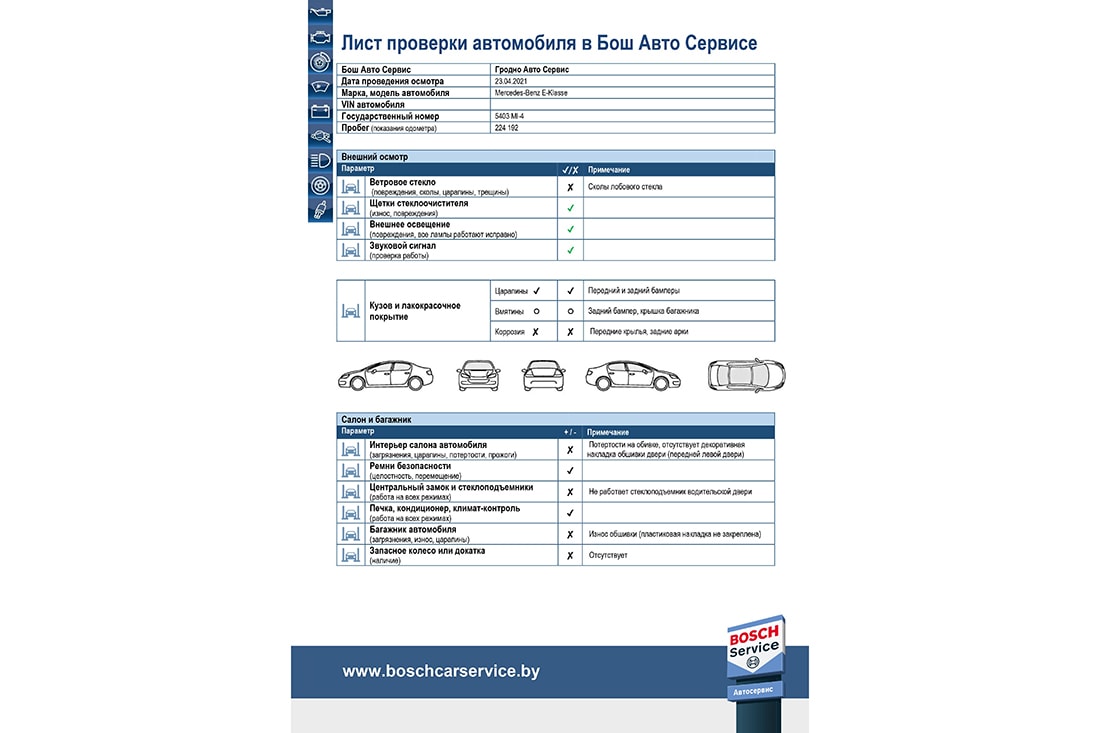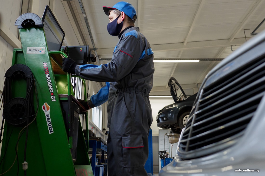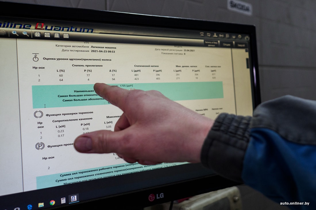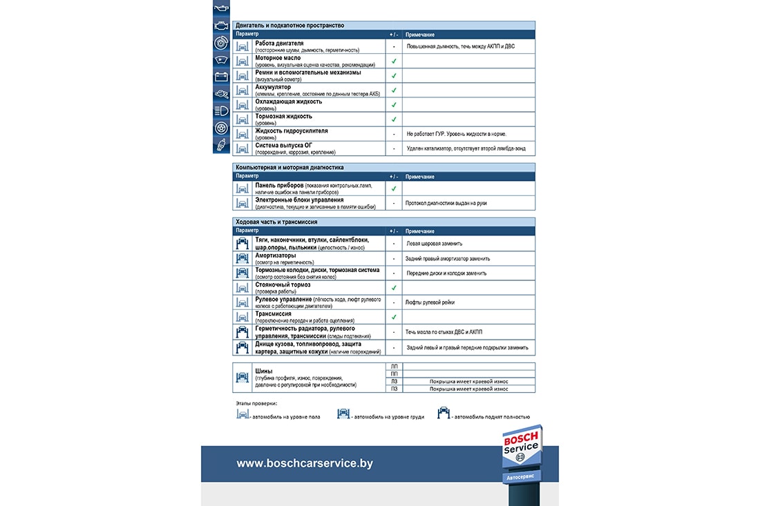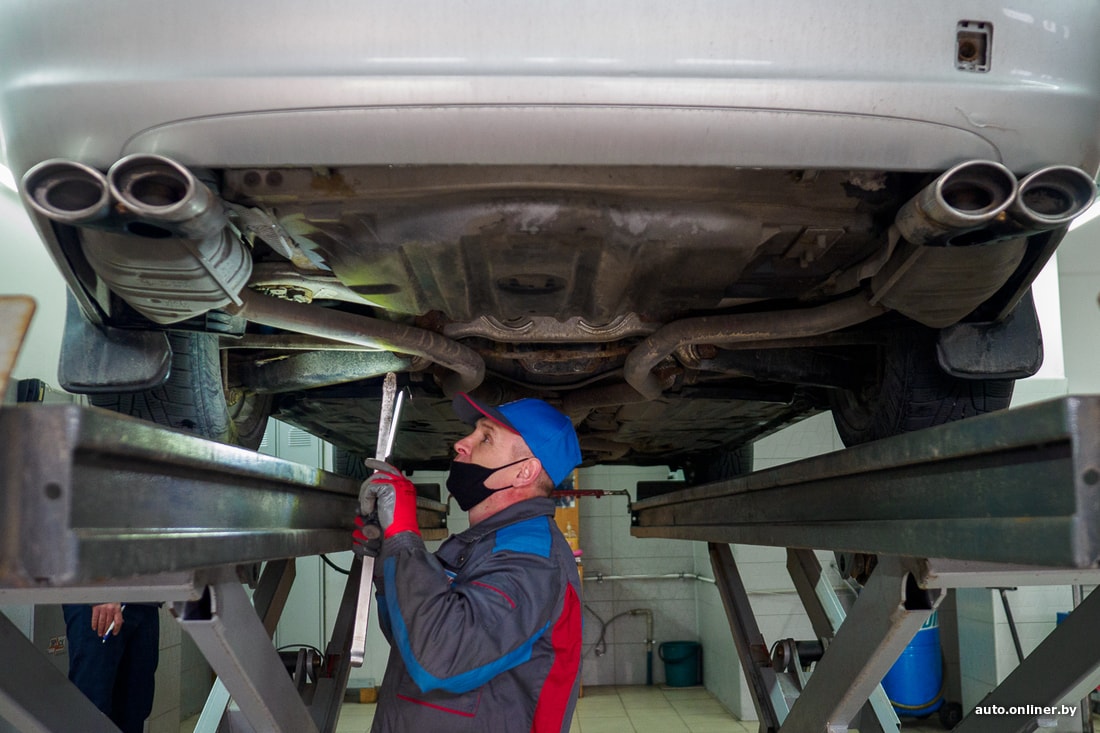 Работа специалистов на станции «Бош Авто Сервис „Гродноавтосервис“» была построена следующим образом: сначала автомобиль загнали на стенд для проверки подвески, после был проведен визуальный осмотр экстерьера и интерьера, проверка подкапотного пространства и компьютерная диагностика. В таком порядке и приводим замечания мастеров.