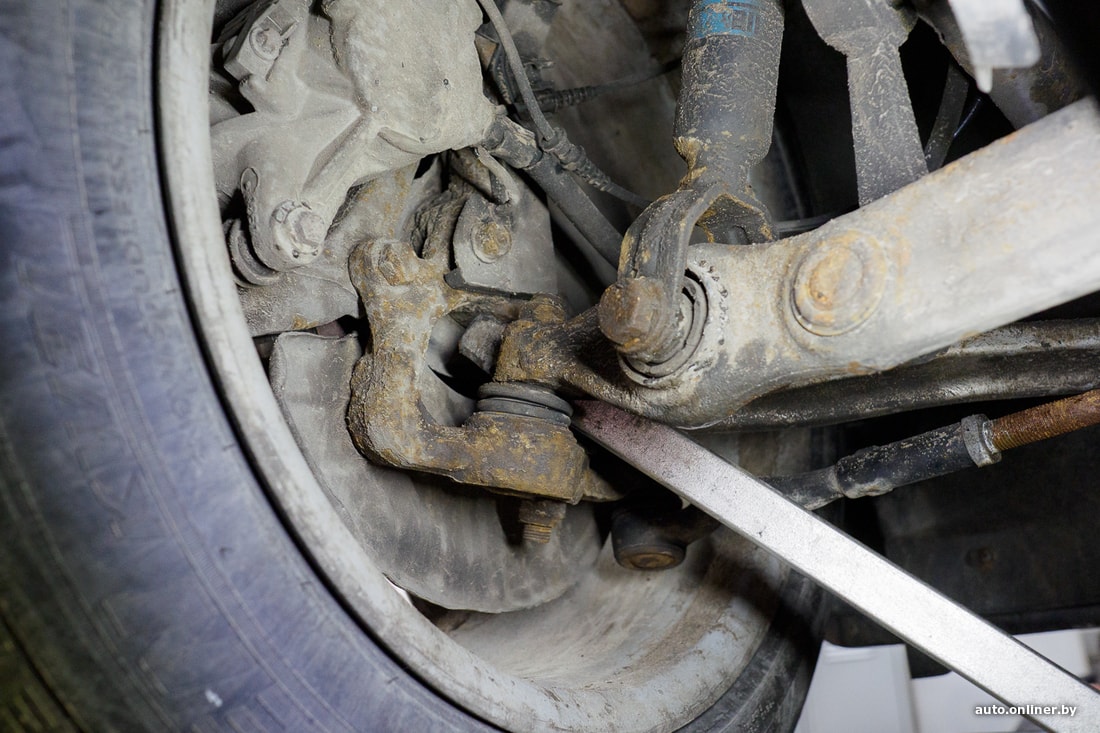 «Необходимо заменить левую шаровую опору, задний правый амортизатор, передние диски вместе с колодками, — начали с ходовой части работники СТО. — Также стоит заменить задний левый и передний правый подкрылки. Есть люфт рулевой рейки. Обнаружена течь масла по стыкам ДВС и коробки передач. Две покрышки имеют краевой износ, необходимо проверить развал-схождение».