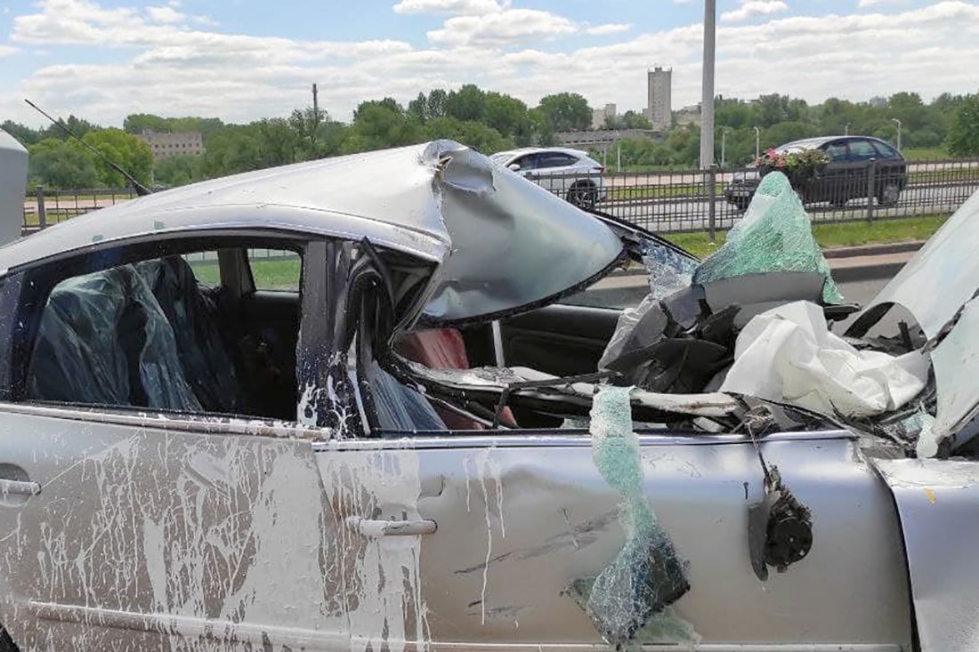 Читатели сообщают корреспонденту Onliner о серьезной аварии, которая произошла сегодня утром на проспекте Дзержинского в Минске. В районе станции метро «Михалово» легковой автомобиль врезался в машину дорожников.