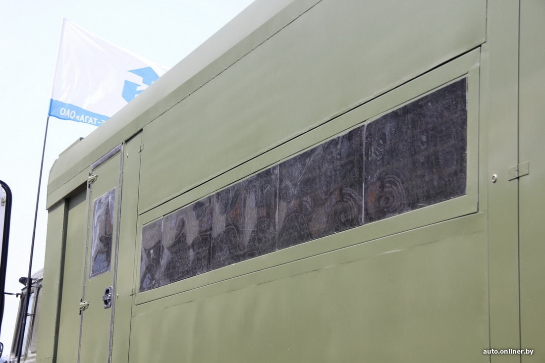 Еще один командный пункт управления огнем артиллерийского дивизиона на шасси МЗКТ-500200 — тоже премьера выставки. Кузов изготовлен силами ОАО «Агат — электромеханический завод». Экипаж машины — 5 человек.