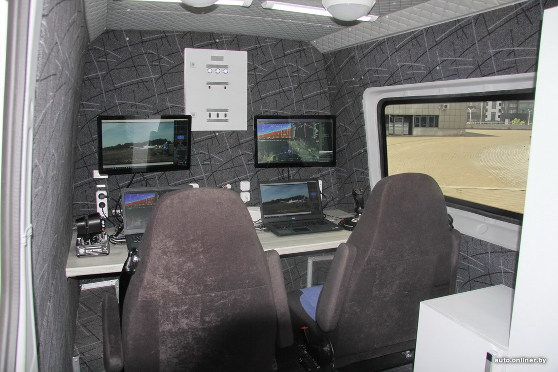 А вот эта машина не борется с беспилотниками, а управляет ими. На базе Volkswagen Crafter РУП «Научно-производственный центр многофункциональных беспилотных комплексов» создало мобильный наземный пункт управления беспилотниками наблюдения. Есть система резервного и автономного электроснабжения.