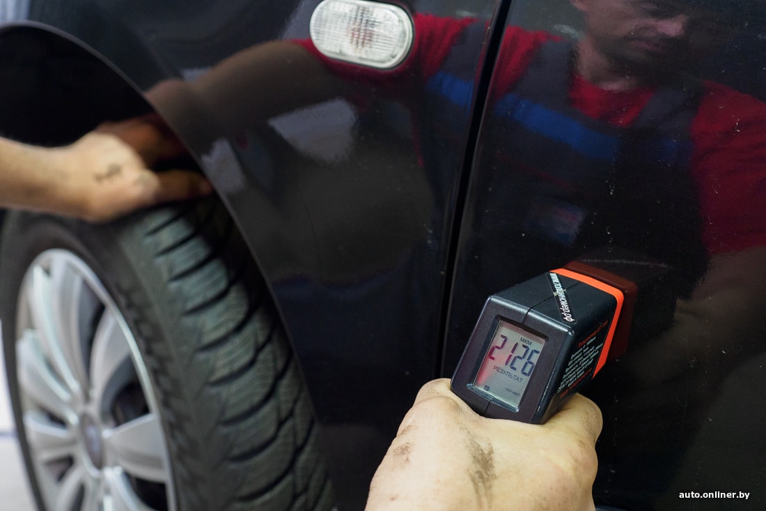 При осмотре кузова обнаружили «жучки» и мелкие сколы. Передняя левая дверь и крышка багажника имеют признаки перекраски. На переднем правом крыле видна трещина. Не горит лампа ближнего света правой фары. Заметны разводы на потолке — последствия протекания.