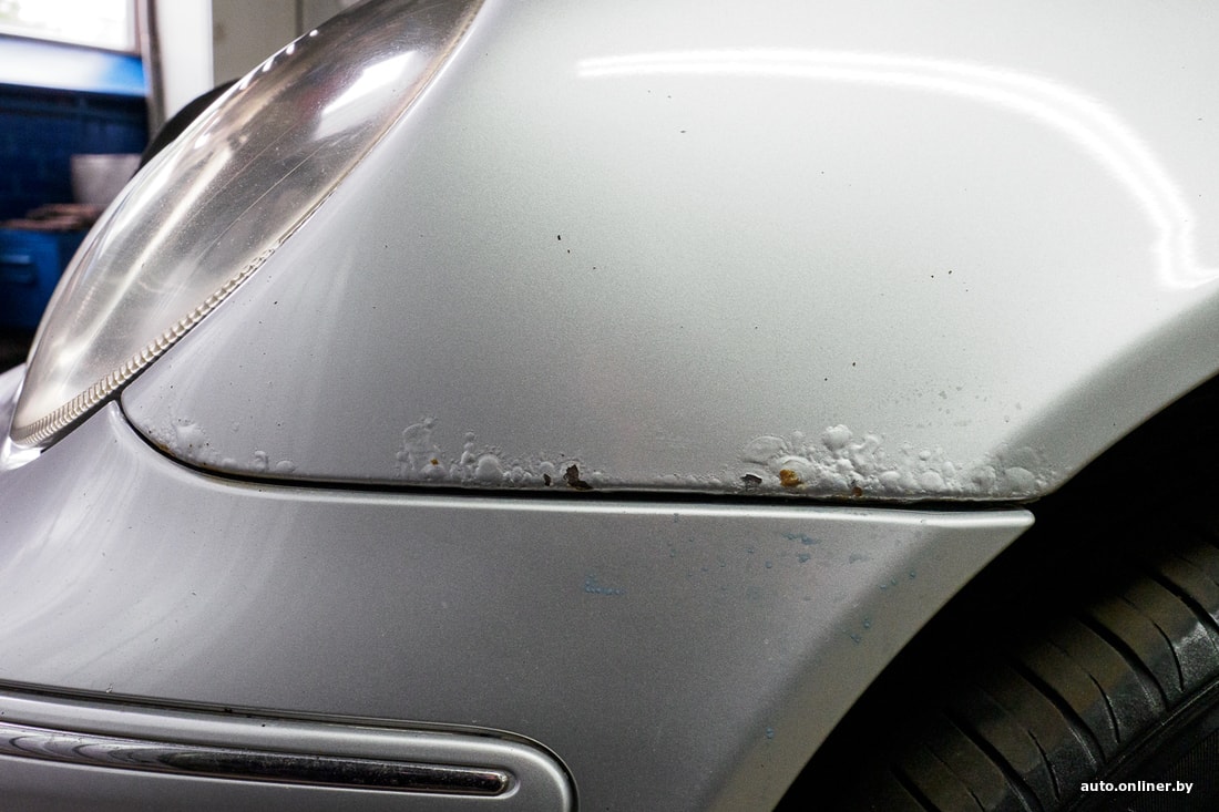 — Кузов покрыт «жучками»: на крыльях и дверях. Заметны вмятина на крышке багажника, трещина переднего бампера. Есть сколы на лобовом стекле. Нужно отрегулировать фары.