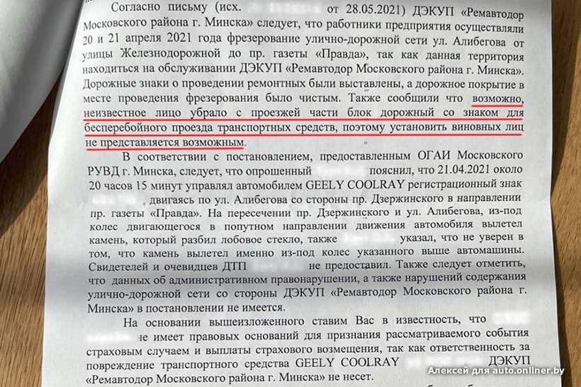 Еще один хороший совет — все общение с официальными органами и организациями вести в письменном виде. Алексей написал заявление и получил на него письменный ответ. В нем два важных момента. Во-первых, Ремавтодор подтвердил, что 20 и 21 апреля проводилось фрезерование улично-дорожной сети улицы Алибегова от улицы Железнодорожной до проспекта Газеты «Правда». «Дорожные знаки о проведении работ были выставлены, а дорожное покрытие в месте проведения фрезерования было чистым», — утверждают в организации.