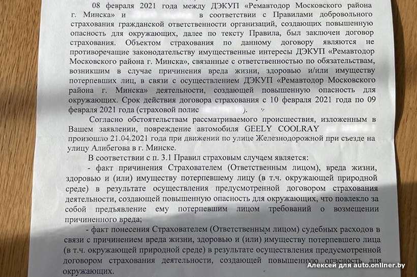 Страховая компания указала на то, что не имеет правовых оснований для признания инцидента с Geely Coolray страховым случаем и выплаты страхового возмещения, так как ответственность за повреждение транспортного средства Ремавтодор не несет.