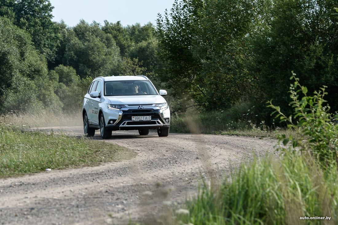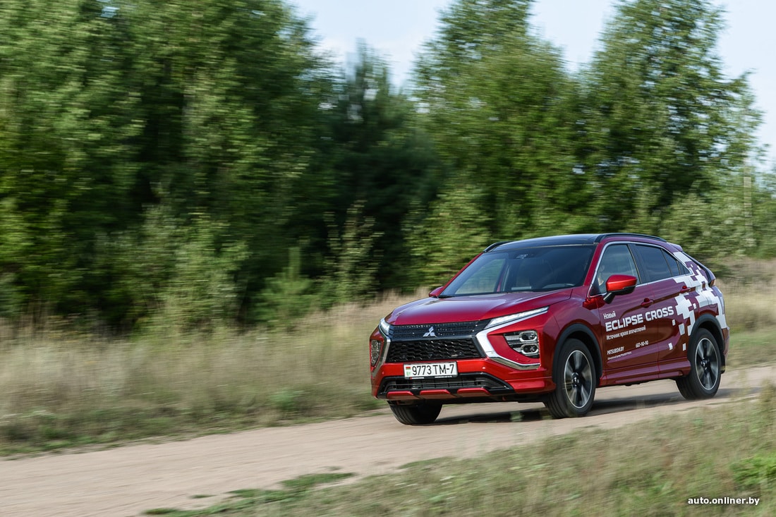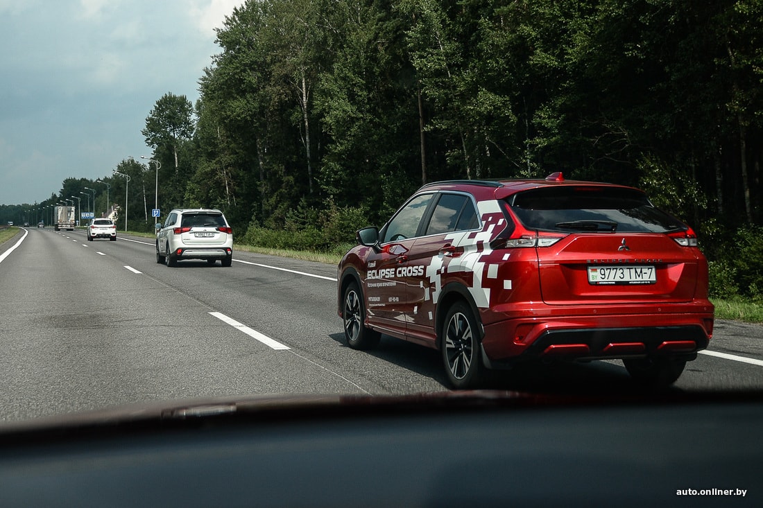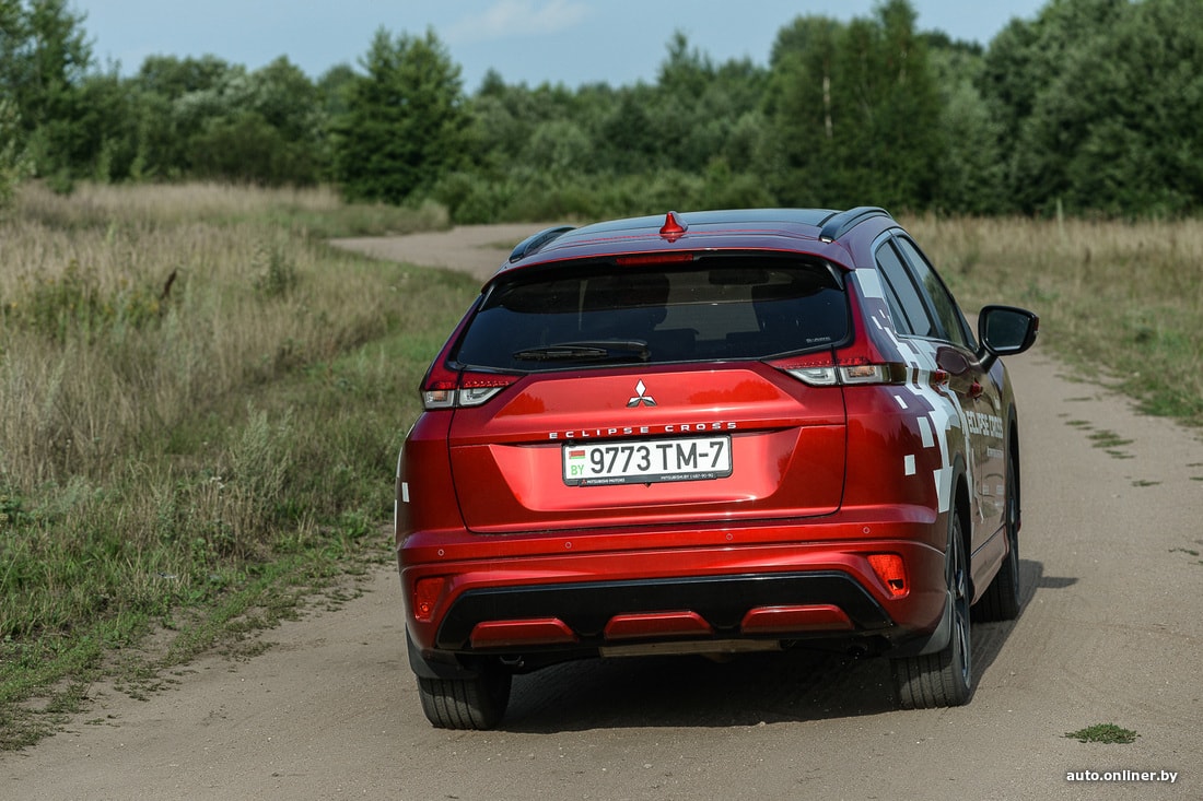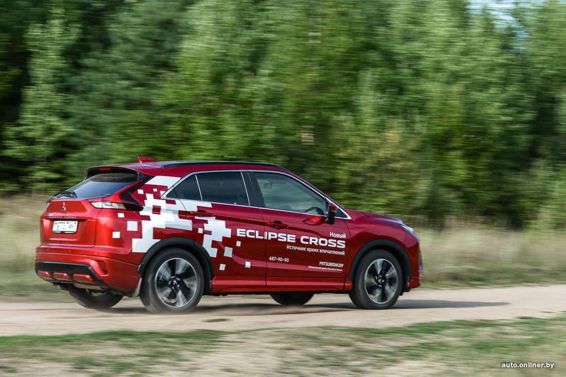 Но мы же отправились в поход с палатками, а не по трассам кататься. Съезжаем вначале на типичную дорогу белорусской периферии и прислушиваемся к поведению подвески. Субъективно, она больше «легковая», нежели внедорожная. Неровности и ямки чувствуются — пусть и не так явно, как на типично городских хетчбэках. Да и в целом Eclipse Cross в сравнении с «коллегами» выглядит более приземистым (клиренс 199 мм, когда у других 215). Скорее подходит для летних вылазок на природу из города, чем для постоянного использования в отдалении от урбан-цивилизации.