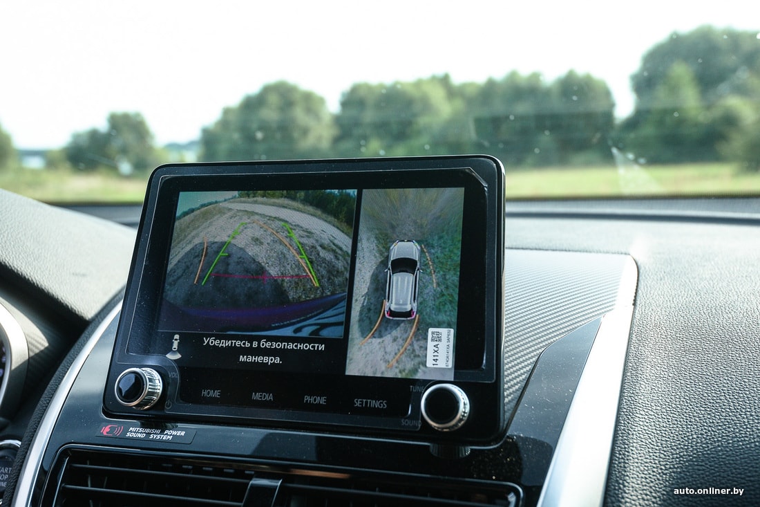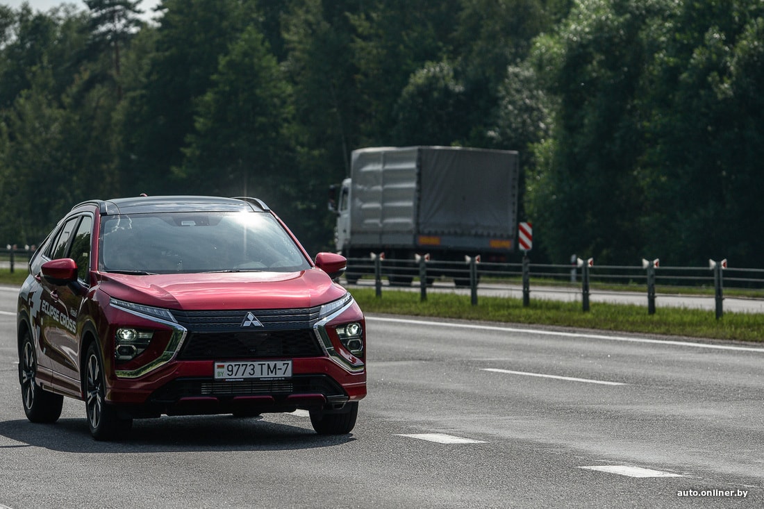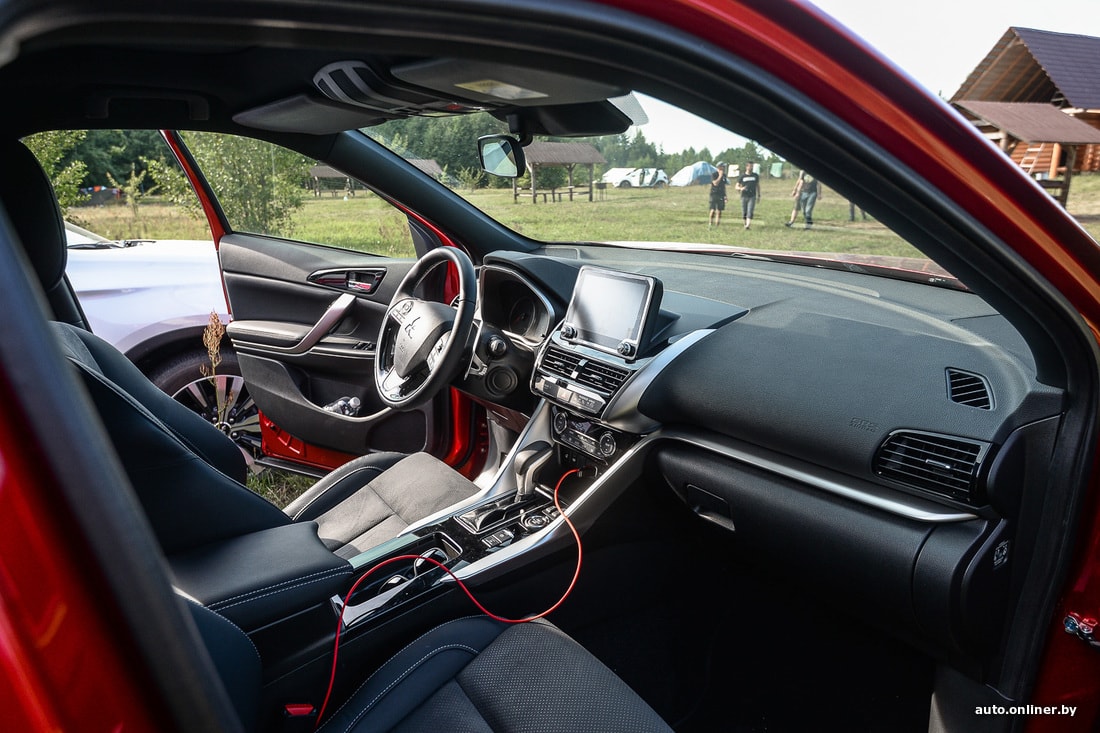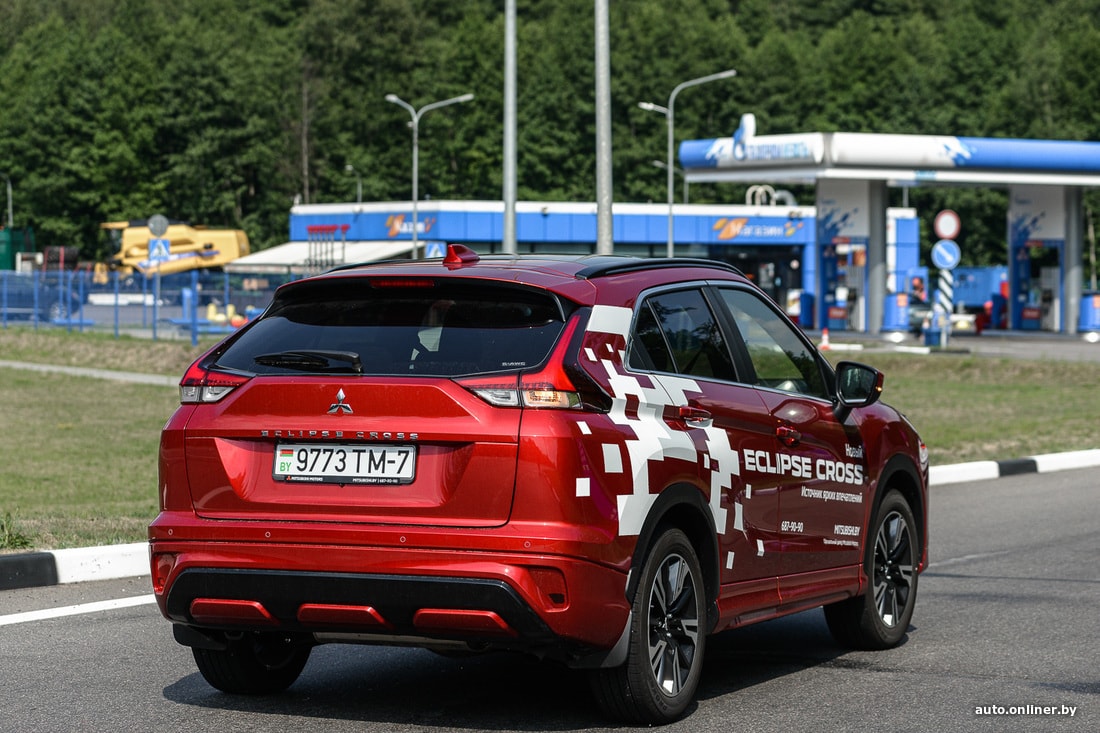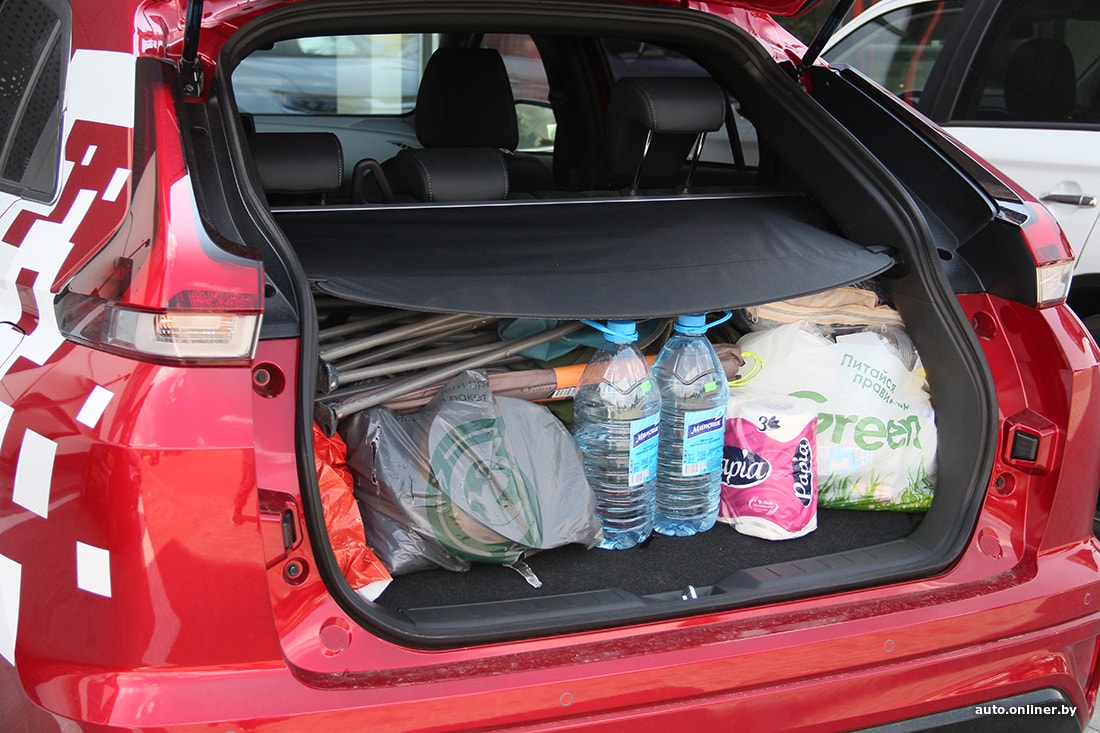 Но мы же отправились в поход с палатками, а не по трассам кататься. Съезжаем вначале на типичную дорогу белорусской периферии и прислушиваемся к поведению подвески. Субъективно, она больше «легковая», нежели внедорожная. Неровности и ямки чувствуются — пусть и не так явно, как на типично городских хетчбэках. Да и в целом Eclipse Cross в сравнении с «коллегами» выглядит более приземистым (клиренс 199 мм, когда у других 215). Скорее подходит для летних вылазок на природу из города, чем для постоянного использования в отдалении от урбан-цивилизации.
