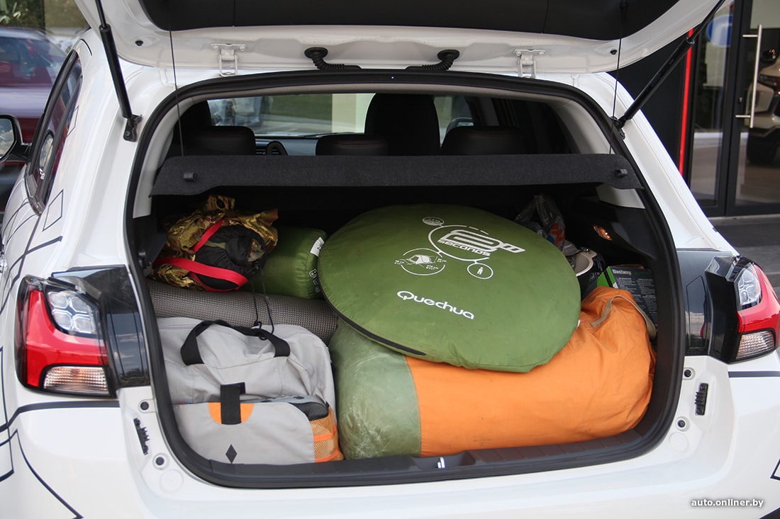 На фото ниже — наглядный пример, как выглядит стандартный набор туриста для похода на уик-энд (палатки, раскладные стулья, питье и еда). Тут же подоспело и первое испытание для машин — вместимость багажников. В каждый пытались вместить тур-комплект для двоих взрослых людей. Обратим внимание, салон вещами захламлять не стали — места хватило.