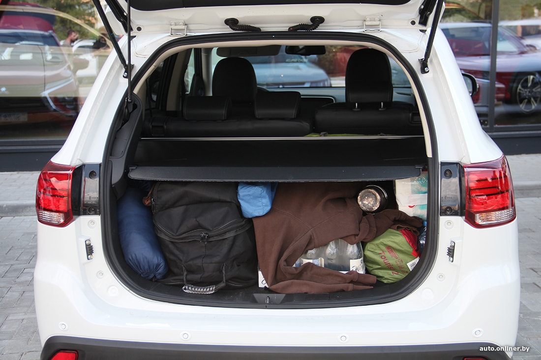 Есть одна особенность устройства багажного отделения моделей. Пол располагается под диагональным уклоном. На бóльшую часть багажа это никак не влияет, а вот с арбузами могут возникнуть проблемы. У самого «пузатого» из тройки — Outlander — багажник наиболее объемный (477 литров до шторки, по данным дилера). Нужно понимать, что здесь может поместиться еще один ряд сидений — у модели есть версия с семью посадочными местами.