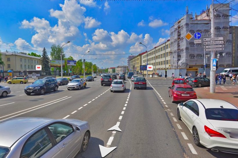 Один из наших читателей совершенно верно заметил, что отчасти похожая ситуация наблюдается на пересечении проспекта Независимости и улицы Сурганова. При движении по проспекту со стороны улицы Калинина, перед перекрестком с улицей Сурганова, можно (и нужно) увидеть знак 4.1.4 «Движение прямо или направо». То есть поворот налево запрещен?
