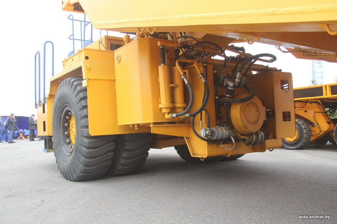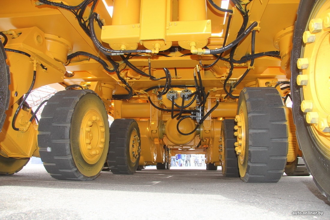 Наиболее необычно БелАЗ-7926 выглядит снизу. Сама платформа опирается на 14 колесных модулей, каждый из которых чем-то напоминает стойку шасси самолета с двумя колесами. Стойки первого, второго, пятого, шестого и седьмого рядов поворотные, благодаря чему скраповоз может развернуться на очень ограниченной площади.
