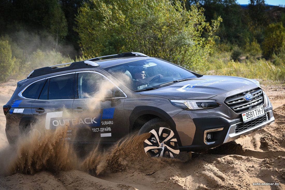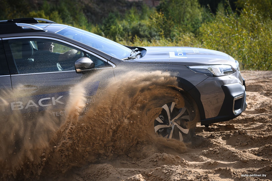 Поскольку Outback «официально» универсал, а не кроссовер, никто и не думал над тем, чтобы как-то улучшить его геометрическую проходимость. Пластиковый обвес, увеличенный дорожный просвет — этого вполне достаточно, чтобы авто справлялось с глубокой колеей или песчаным пляжем. Однако как только вы повышаете ставки и выезжаете на сложный рельеф, появляются проблемы: передний свес слишком длинный, и вы постоянно цепляетесь передней «губой» за все, что видите. При этом к трансмиссии и электронике вопросов не возникает: мы барахтались в песке минут 40, ничего не перегрелось, машина не застряла. Но за передним бампером нужно было следить перед каждым препятствием.