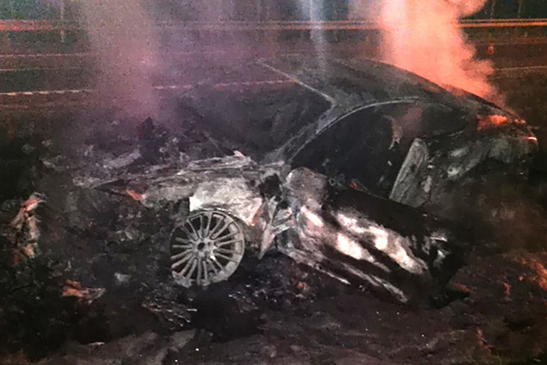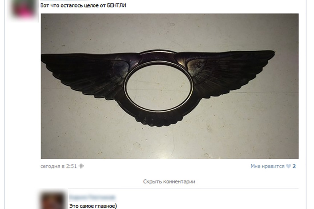 В обзоре можно вспомнить и «рекордсменов» начала 2010-х. Никак не забыть историю сгоревшего дотла Bentley Continental GT с доработками от Mansory за €300 тыс. Авария и последующий пожар имели место на трассе М2 в далеком 2013 году. Все случилось во время проведения уличных гонок. Водитель купе в них не участвовал, но двигался с большой скоростью со стороны аэропорта. В это время один из зрителей совершал разворот. После удара обе машины отбросило на еще несколько припаркованных автомобилей, а Bentley загорелся. Многие видели, что после случившегося мужчины сели на железное ограждение и стали пить апельсиновый сок, смотря на догорающий Continental GT. После того как пожар был потушен, на месте ДТП появились люди, которые с криками «Мне значок», «А мне турбина» стали копаться в том, что осталось от люксового купе.