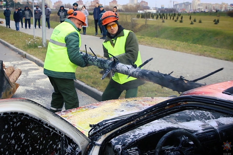 Расписанная надписями машина горит, из нее торчит дерево. Что происходит?