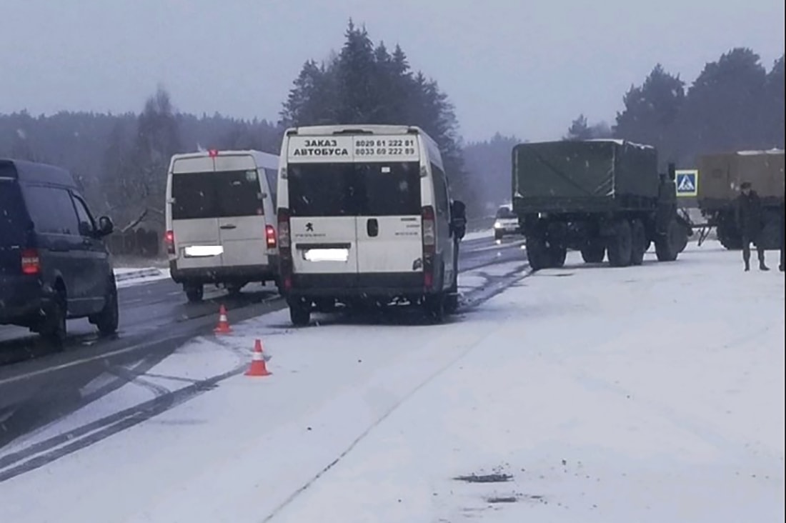 Вечером стало известно о серьезных авариях в условиях снегопада. Так, например, днем на трассе Р28 (Минск — Молодечно — Нарочь) столкнулись «Урал» и Peugeot Boxer. «Молодой человек 2001 г. р., управлявший грузовиком, после остановки на обочине начал движение, — сообщили в ГАИ Минской области. — При этом не уступил дорогу попутному Peugeot. В результате произошло попутное столкновение. Пострадал непристегнутый 14-летний пассажир буса, он был доставлен в медучреждение».