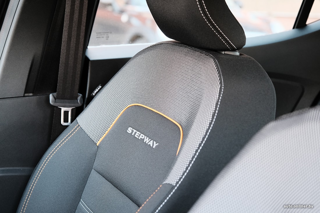 Что касается версии Stepway, она в Европе получила индивидуальные стилистические элементы (включая уникальную отделку передней панели), другие кресла с логотипами серии. Там-сям разбросаны оранжевые вставки. На передней панели и дверных картах — интересные тканевые вставки. Выглядят они отлично, посмотрим, что будет с практичностью. Кресла у автомобиля стали более удобными. Блок автоматического климат-контроля — такой же, как у новых Duster и Arkana.