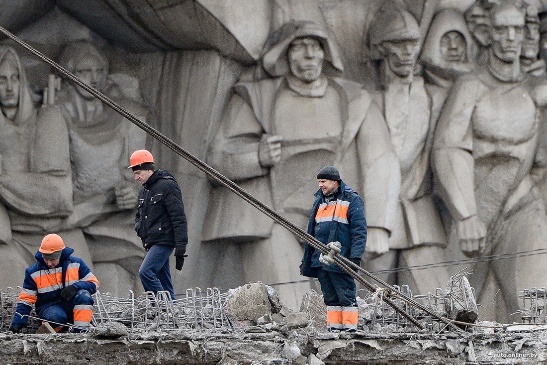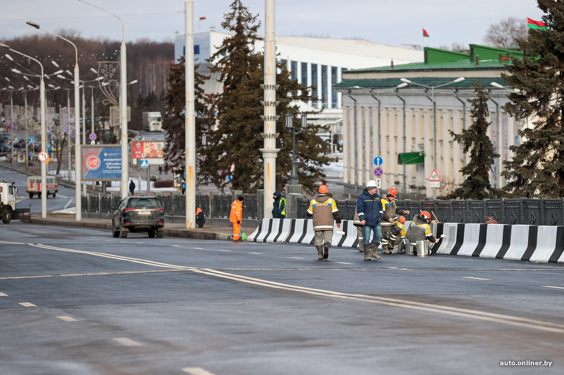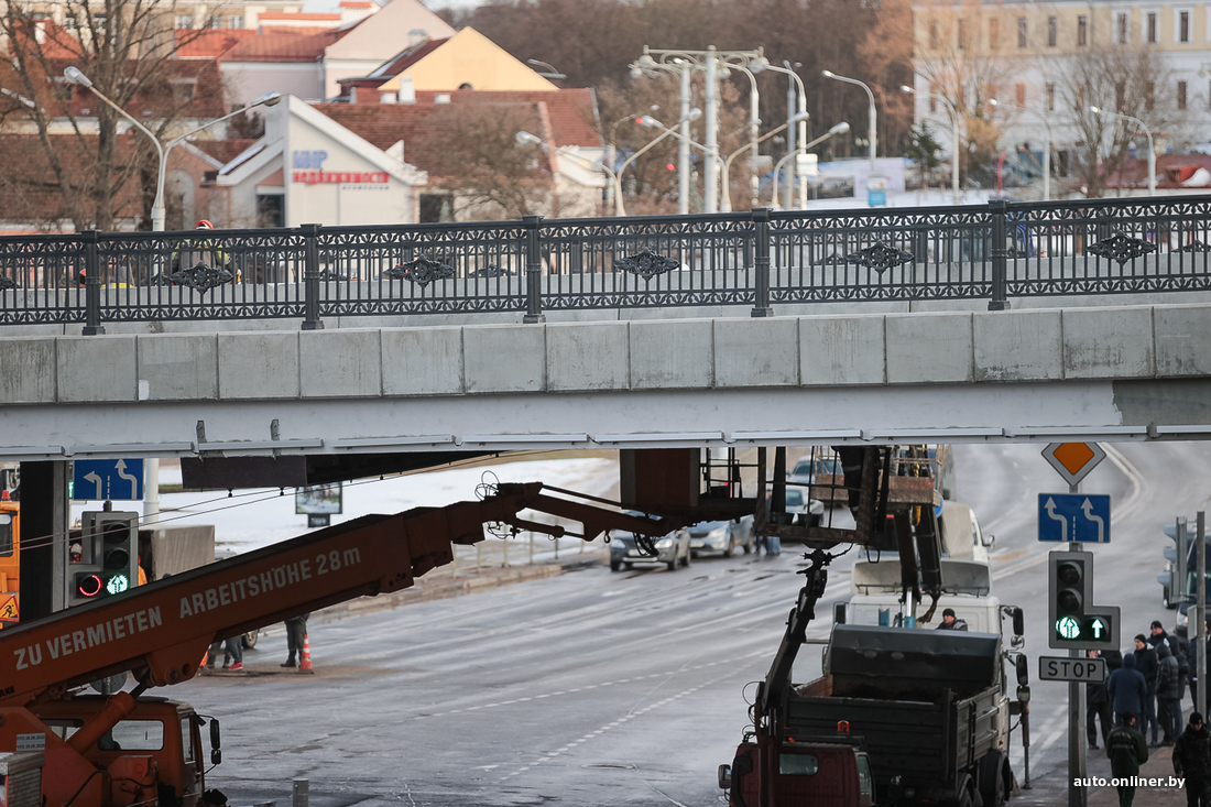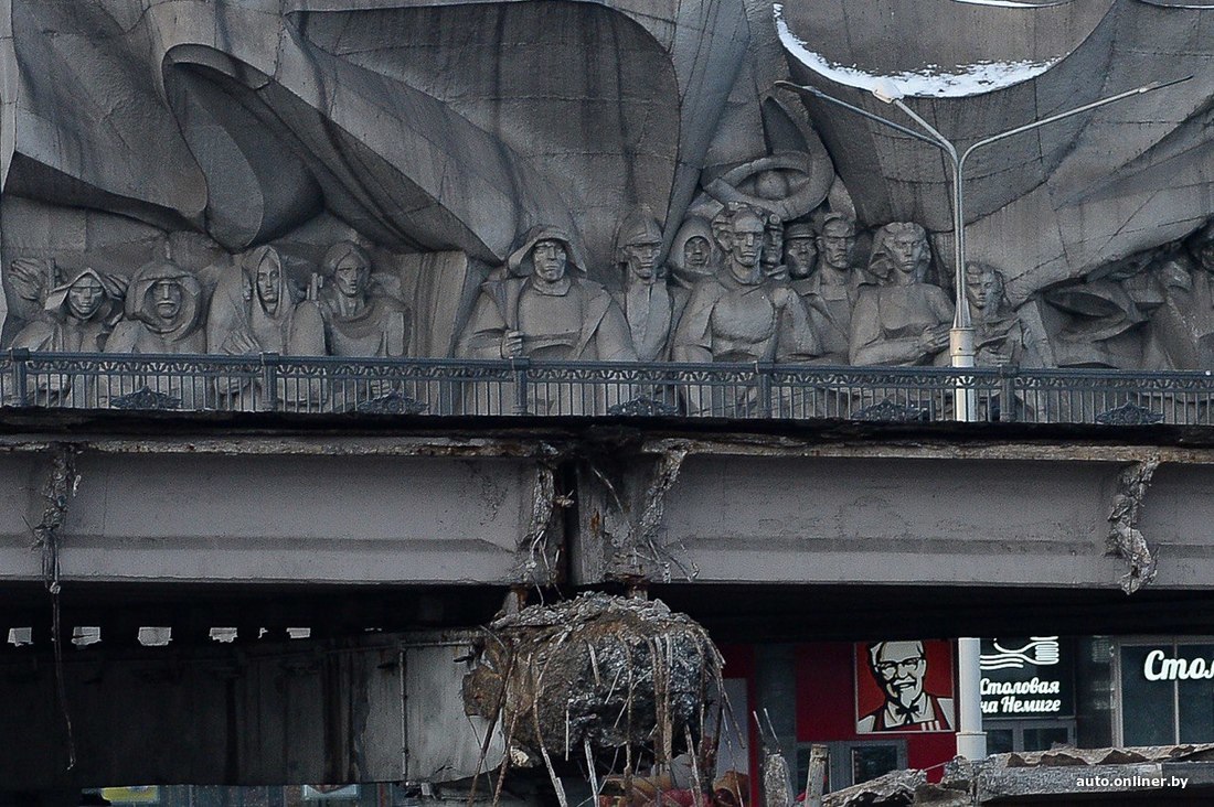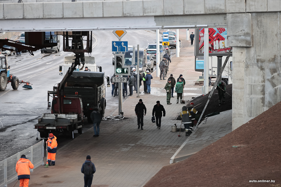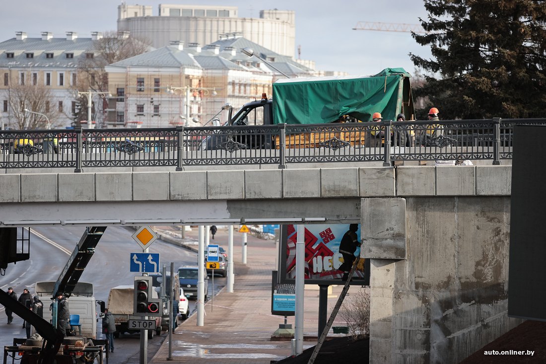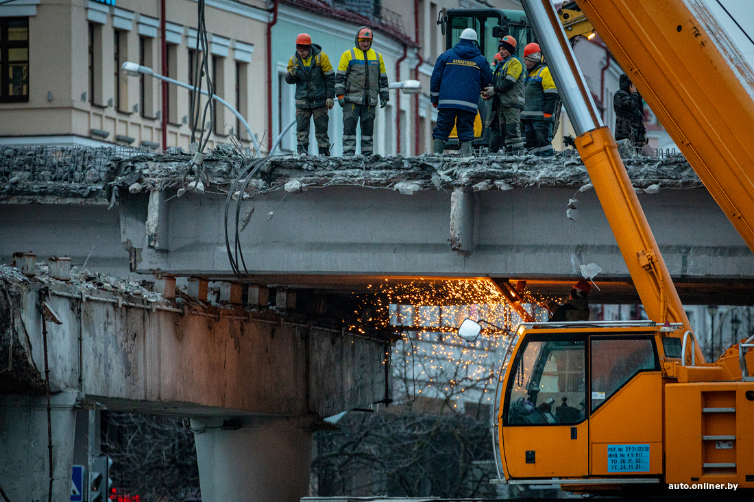 На месте происшествия убирали завалы, демонтировали уже негодный для движения путепровод. Первоначальная информация о том, что на возведение нового моста уйдут месяцы, была быстро опровергнута председателем Мингорисполкома.