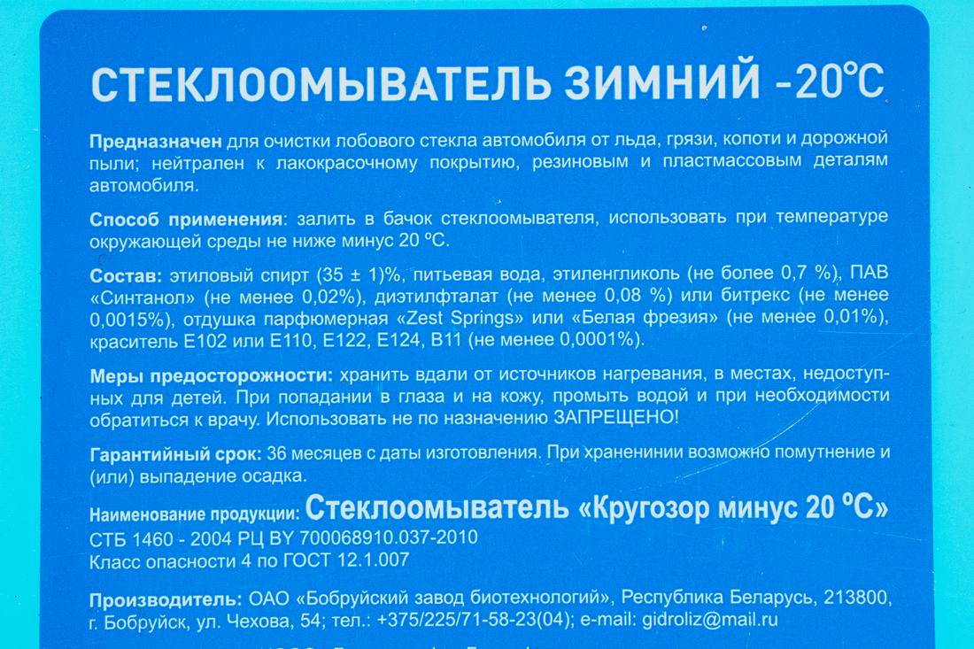 Во время закупки мы случайно наткнулись на три разные упаковки одного бренда — «Кругозор −20». Производство одно и то же — отечественный Бобруйский завод биотехнологий. На заправках «Белоруснефти» жидкость продавалась за 11,99 рубля и имела синюю этикетку. Тот же «Кругозор −20», но с желтой этикеткой можно было купить в сети гипермаркетов «Гиппо» за 9,99 рубля. На оборотной стороне фирменной незамерзайки сети «Газпромнефть» за 14,16 рубля значилось все то же — «Стеклоомыватель „Кругозор минус 20 С“». Нас интересовало, покажет ли исследование хоть какую-то разницу между тремя «Кругозорами»?