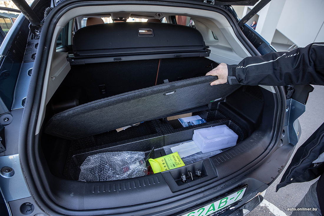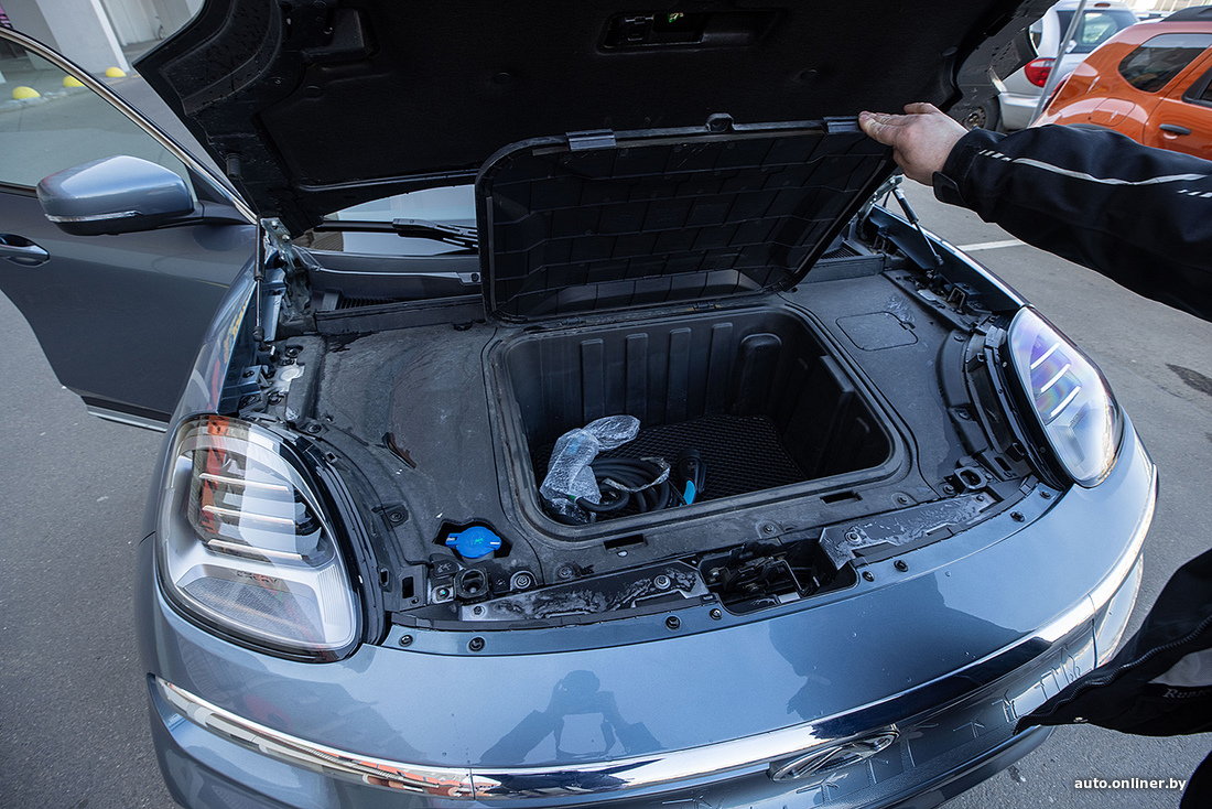 В плане практичности кроссовер ничем особым не выделяется: спереди под капотом есть ниша на 60 литров, а объем заднего багажника составляет 386 литров. Правда, непонятно, учтено ли здесь место в «подполье» — а его там довольно много, можно разместить всю необходимую мелочовку. При этом запасное колесо электрокару не полагается, только ремкомплект с компрессором.